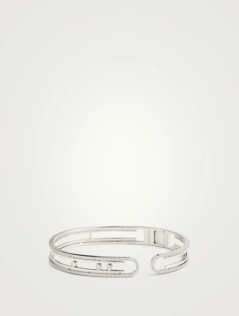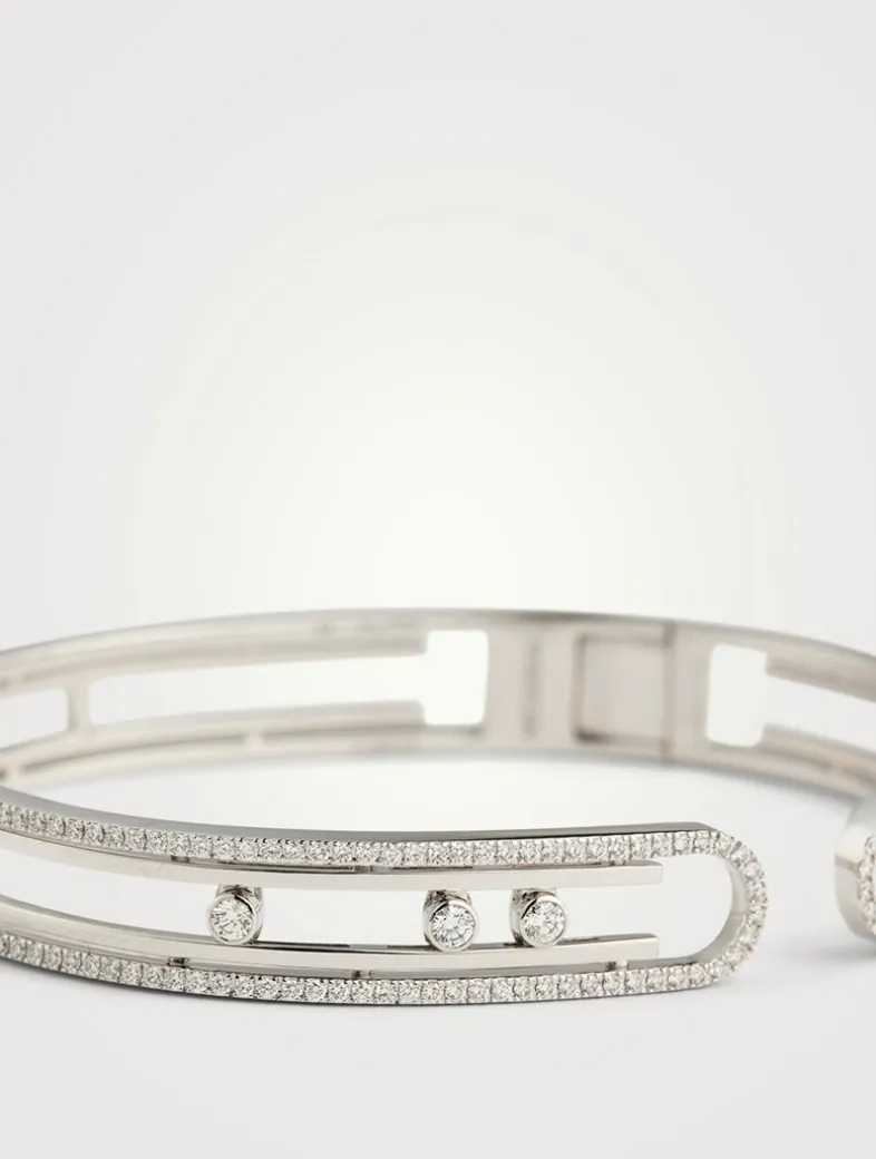 Along with the 18k gold, this elegant bangle bracelet features the Move diamonds that move freely with motion, and resonates with the polished gold and micro pavé-set diamonds.