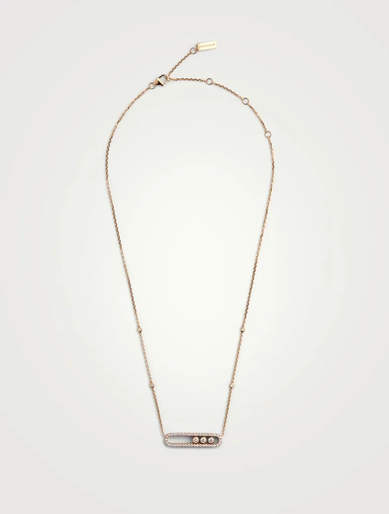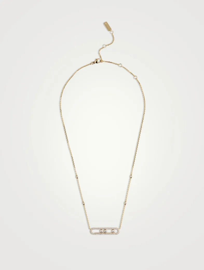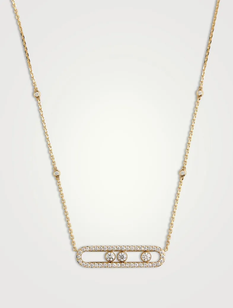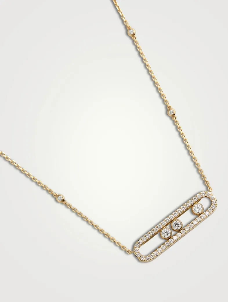 This pavé necklace in 18k yellow gold is part of Move, the signature collection of the Maison Messika. Fully handcrafted, it is set with three brilliant-cut diamonds in motion. This diamond jewel features a modern design, with a precious pavé cage and a double chain, while the fine setting echoes back the yellow gold enhancing the stones purity. The three diamonds’ movement, symbols of the love of yesterday, today, and tomorrow, enlightens the luminous effects of the selected stones.