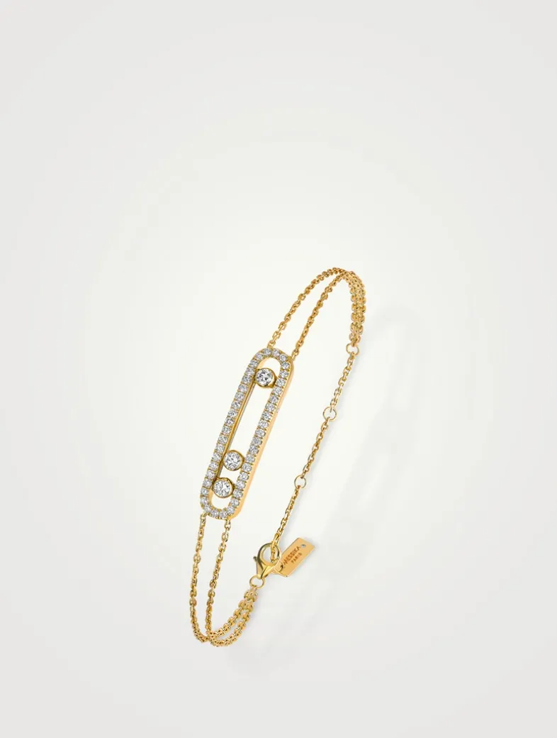 This pavé bracelet in 18k white gold is part of Move, the signature collection of the Maison Messika. Fully handcrafted, it is set with three brilliant-cut diamonds in motion. The motion of the three diamonds -symbols of the love of yesterday, today, and tomorrow – enhances the purity of the fine stones selected with a great care. This double white gold pavé diamond bracelet is perfect to embody a precious moment and will embrace your cuff with strength and boldness.