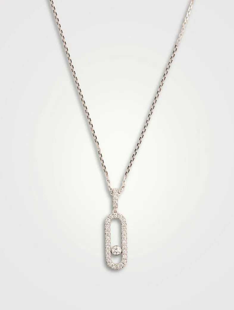 Set with diamonds at the center, this 18k gold necklace features a playful mobile diamond, and a sliding clasp making it adjustable.