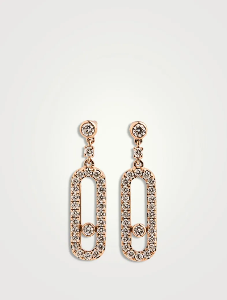 Part of the Move jewellery collection, these dangling 18k gold earrings are set with a brilliant cut diamonds.