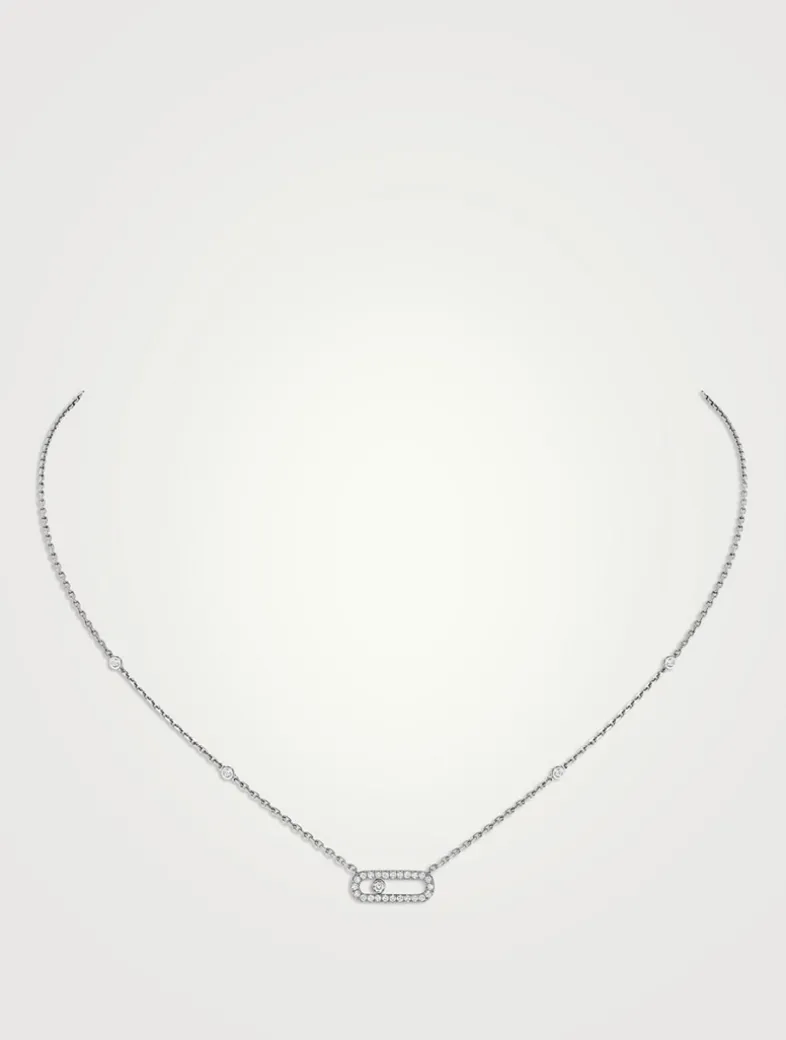 Fall for this 18k gold pavé diamond necklace, fully handcrafted and set with a brilliant-cut diamond. Its fine chain is adorned by the Move cage holding a close set diamond that moves and shines according to your gestures.