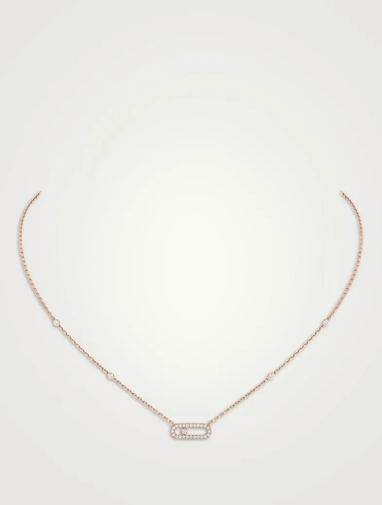 Fall for this 18k gold pavé diamond necklace, fully handcrafted and set with a brilliant-cut diamond. Its fine chain is adorned by the Move cage holding a close set diamond that moves and shines according to your gestures.
