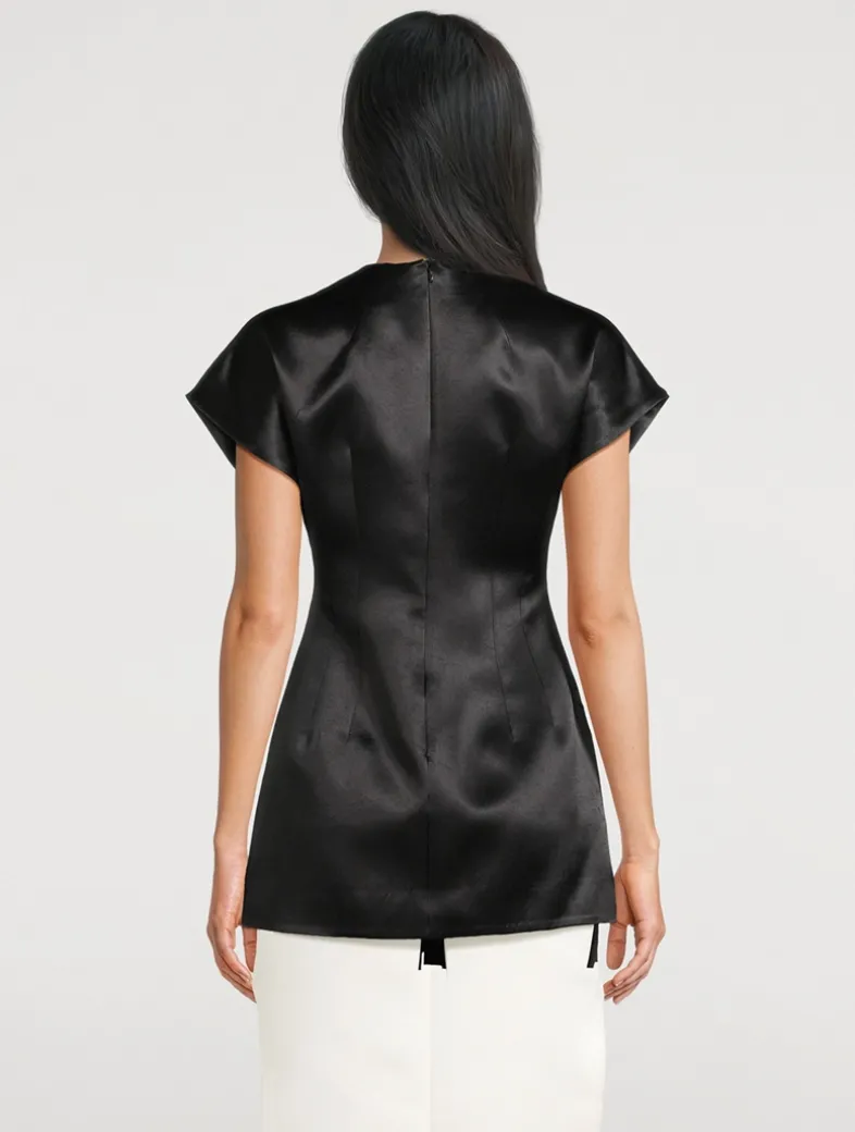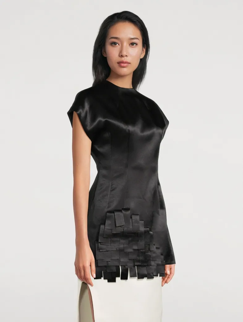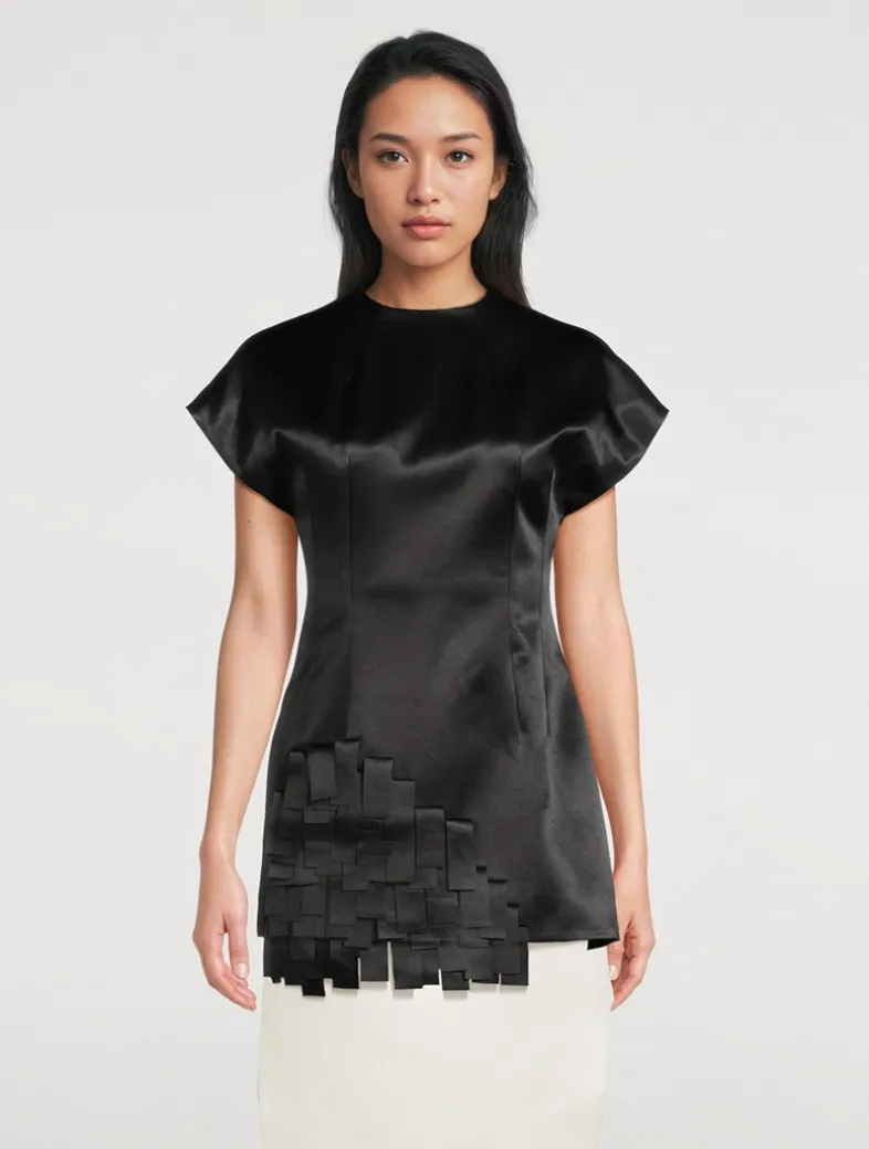 Cut from lustrous satin, this structured top features a round neckline and cap sleeves. Overlapped rectangular appliqués lend texture and form, enhancing the architectural feel.