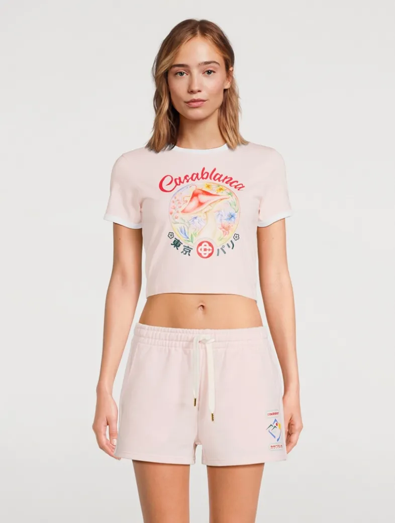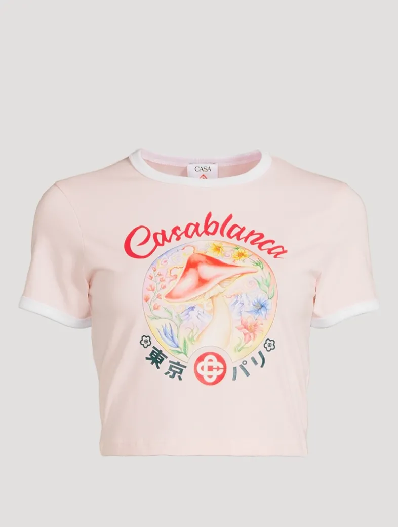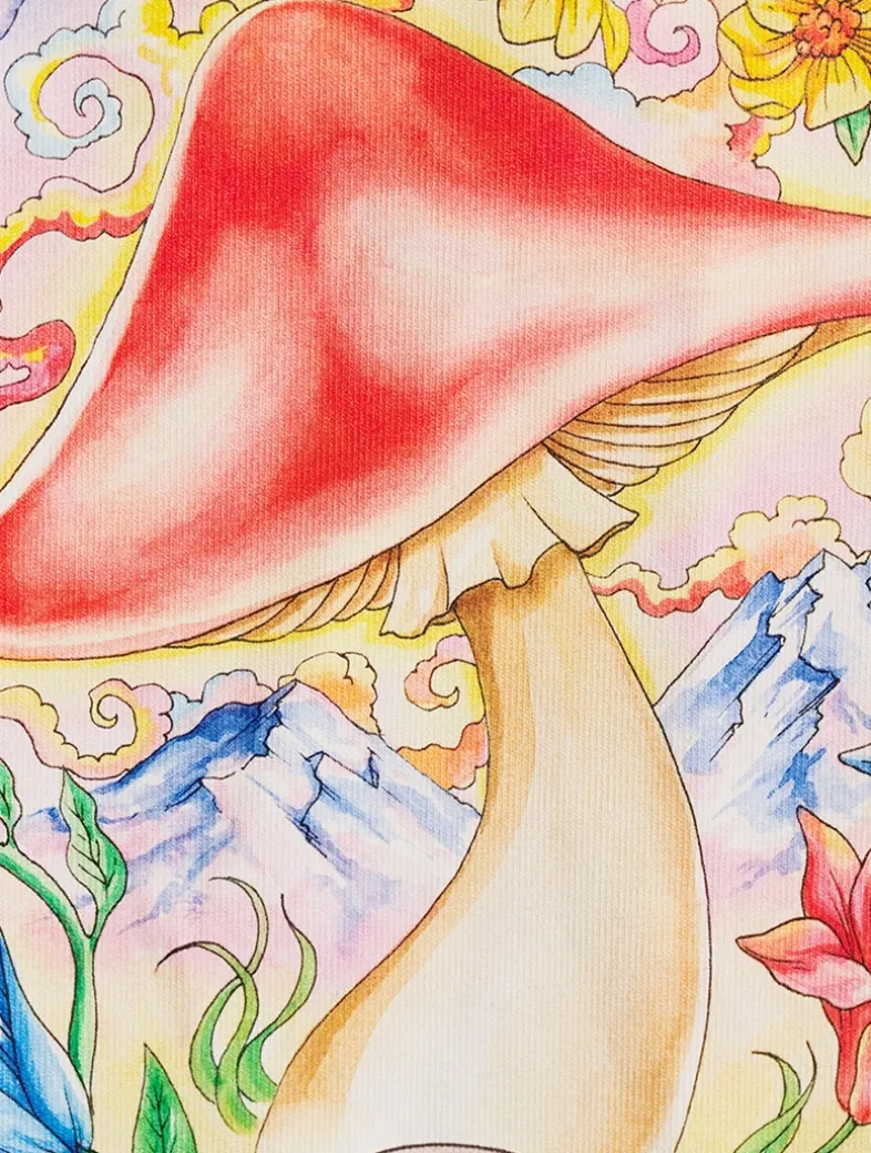 Crafted from cotton jersey with a hint of stretch, this short-sleeve baby tee is printed with a multicolour mushroom motif and is edged with contrast trim at the neckline and cuffs.