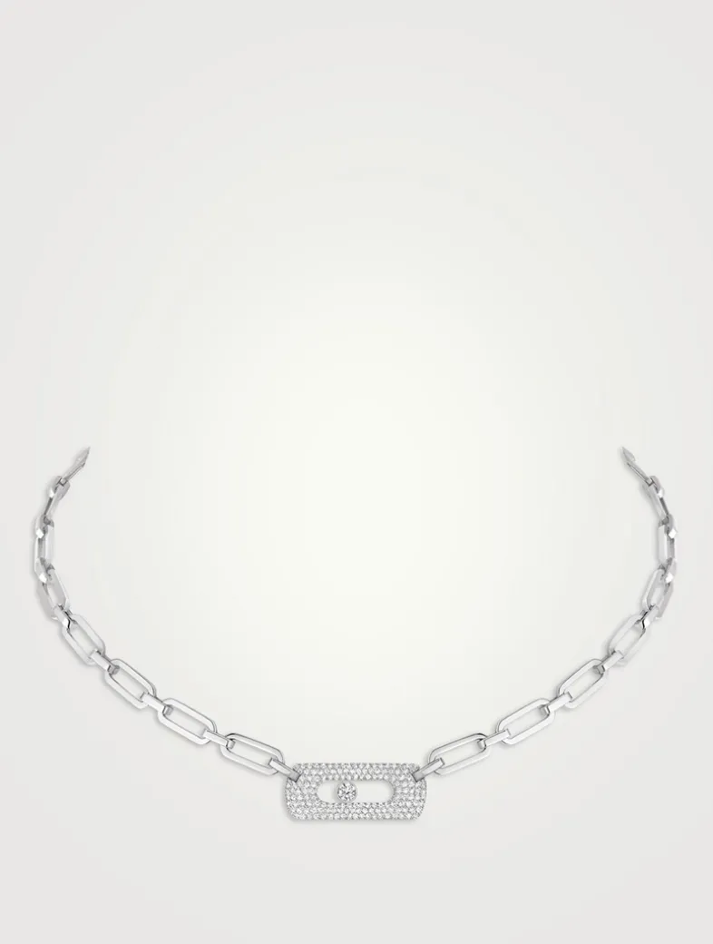 Designed on an extra large 18k gold chain, this 1960s inspired handmade necklace features a signature moving diamond centerpiece.