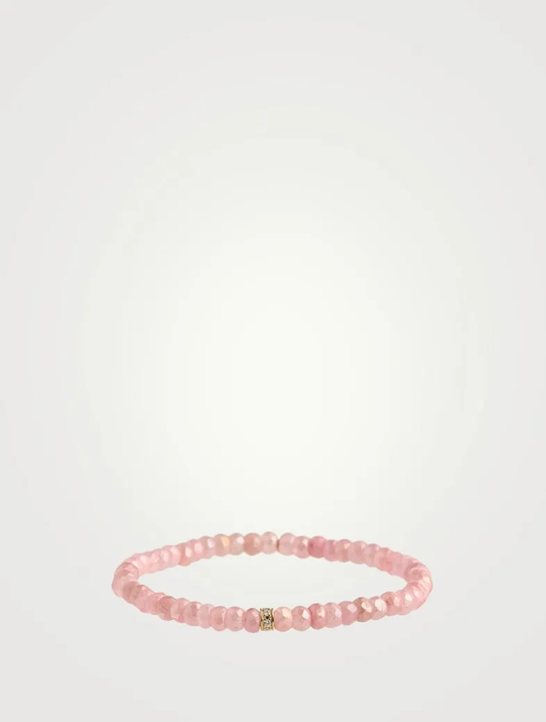 Strung with mystic pink grapolite beads, this slip-on bracelet features a pavé diamond wheel. All Sydney Evan beaded bracelets are strung on a stretch cord along with a 14k gold SE logo charm.