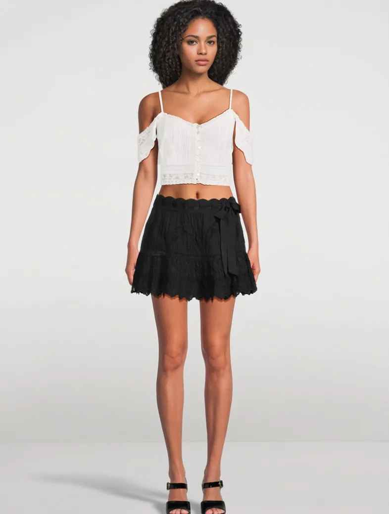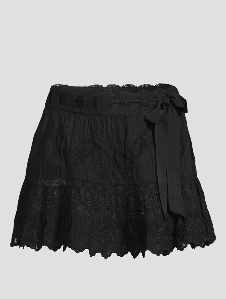 Cut to an A-line silhouette, this cotton mini has scalloped edges and a matching fabric belt that ties at the hip.