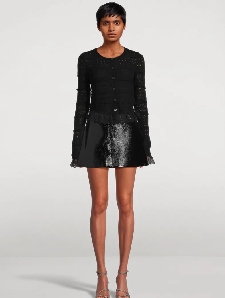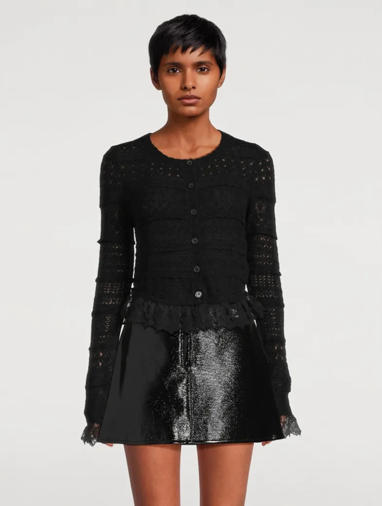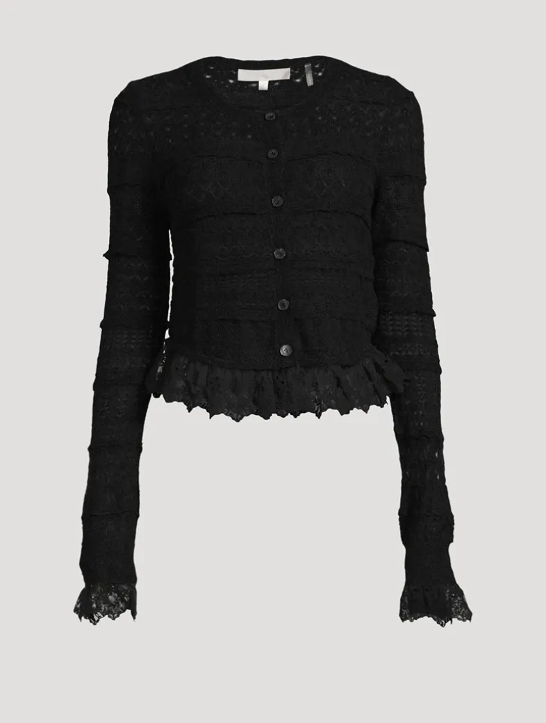 The Norden Cardigan stuns with a lightweight alpaca blended fabric with a variation of intricate pointelle stitches throughout the body. All in the details, this dreamy knit features custom embroidered lace at the hem and the sleeves. The must-have piece is finished with custom bow-shaped buttons down center front.