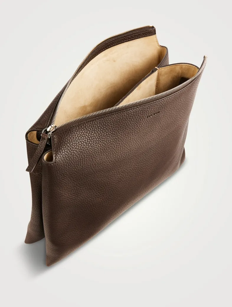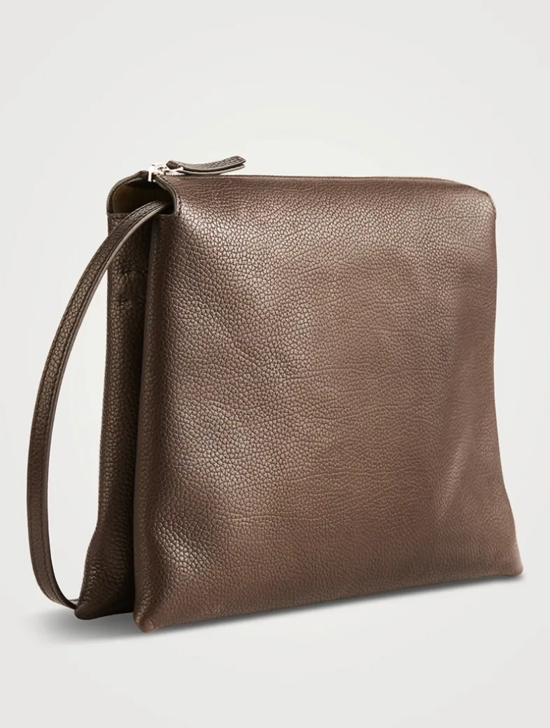 Named for its dual compartments, this softly structured shoulder bag is crafted in grained leather with a seamless construction, adjustable crossbody strap, and zip-top closure.