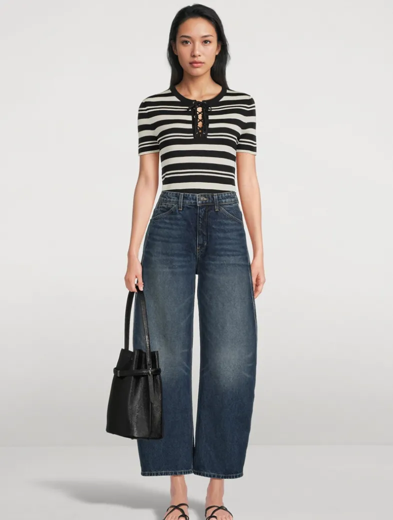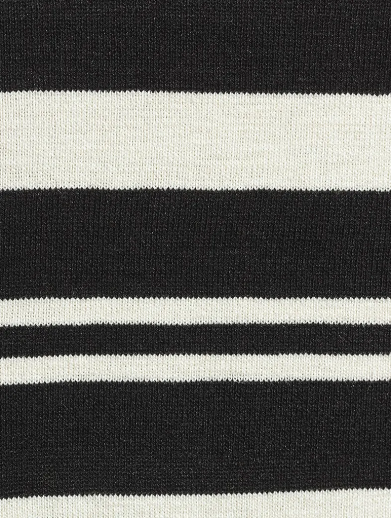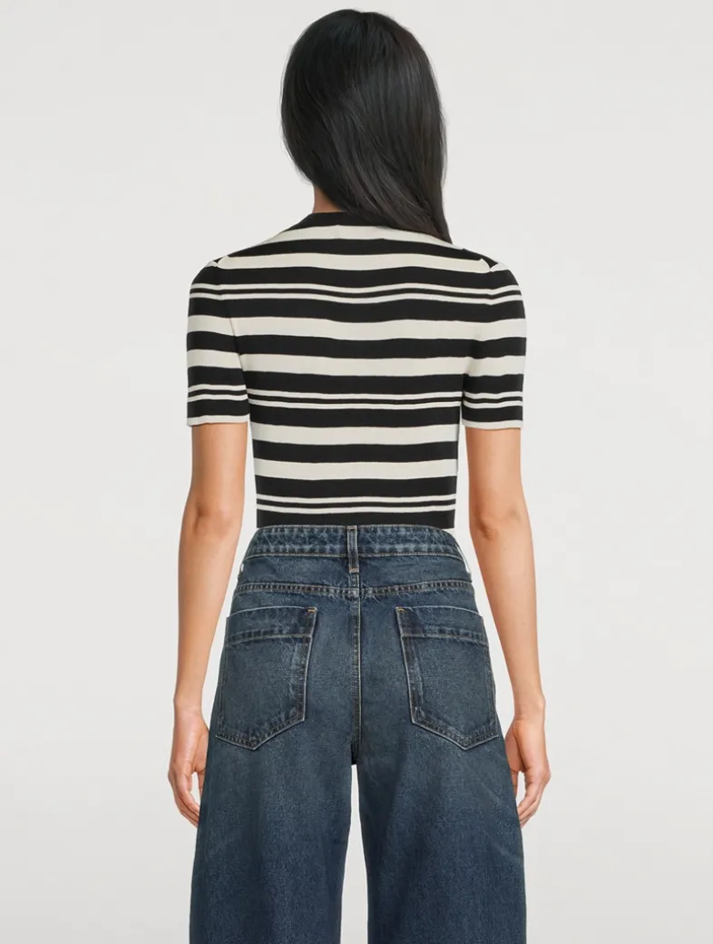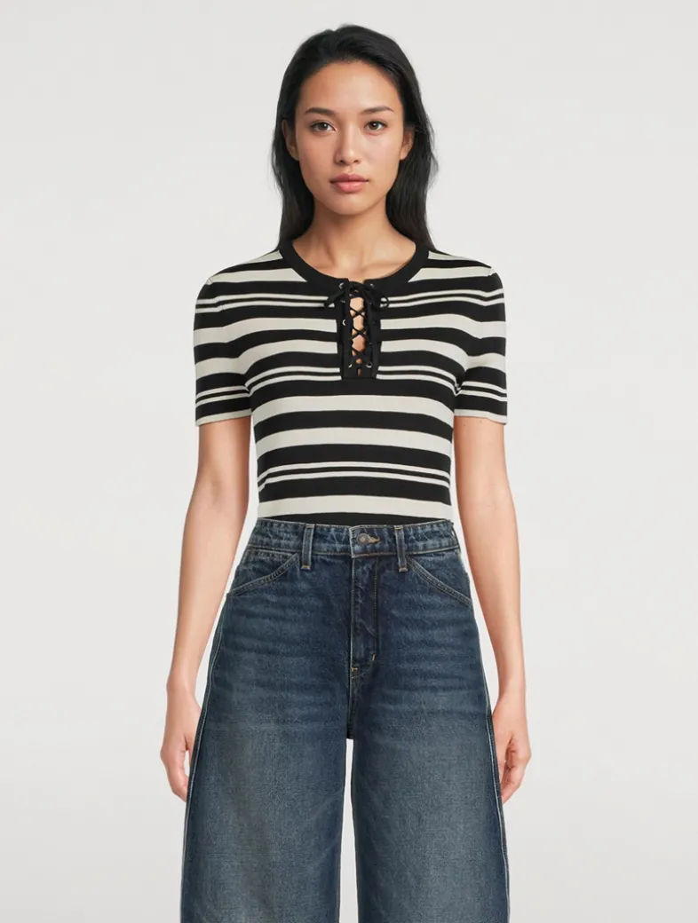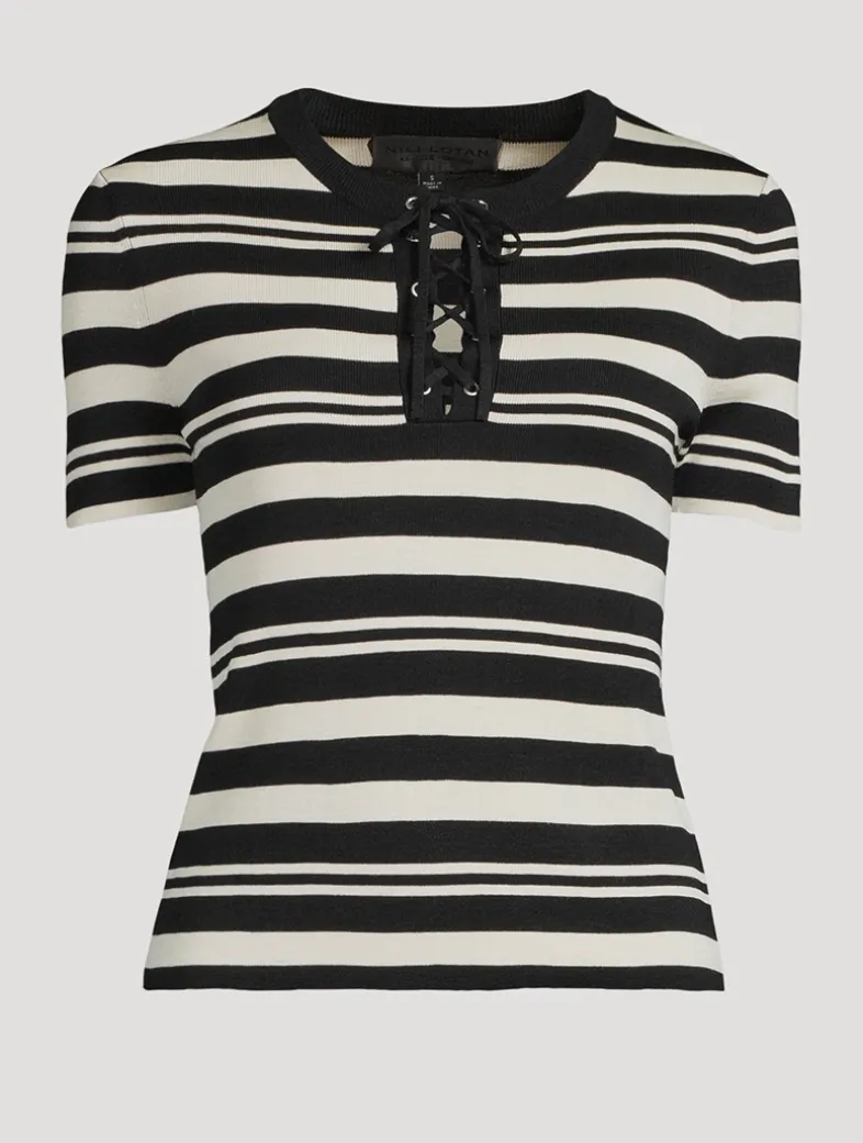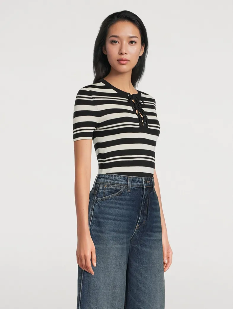 This slim-fit tee is knit in compact stitch Italian silk with classic stripes. It has a notched neckline finished with a lace-up detail.