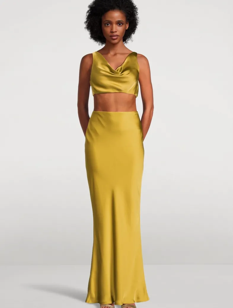 Cut on the bias, this slinky satin skirt hugs your curves and finishes with an elegant fishtail hem.