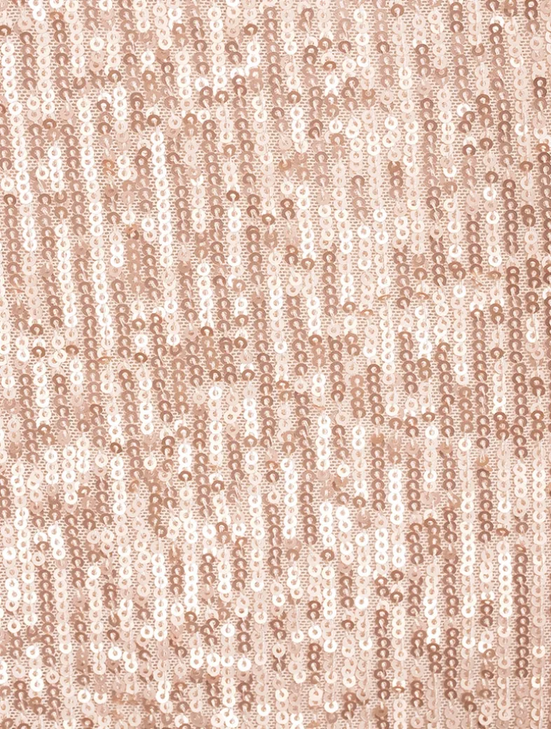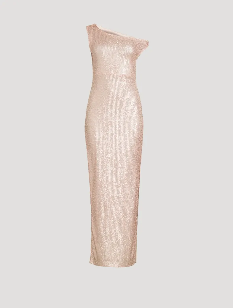 Shimmering sequins lend a sparkling touch to this elegant gown. It is cut to an exquisitely draped silhouette with an asymmetric, off-the-shoulder neckline and a cut-up-to-there side slit.