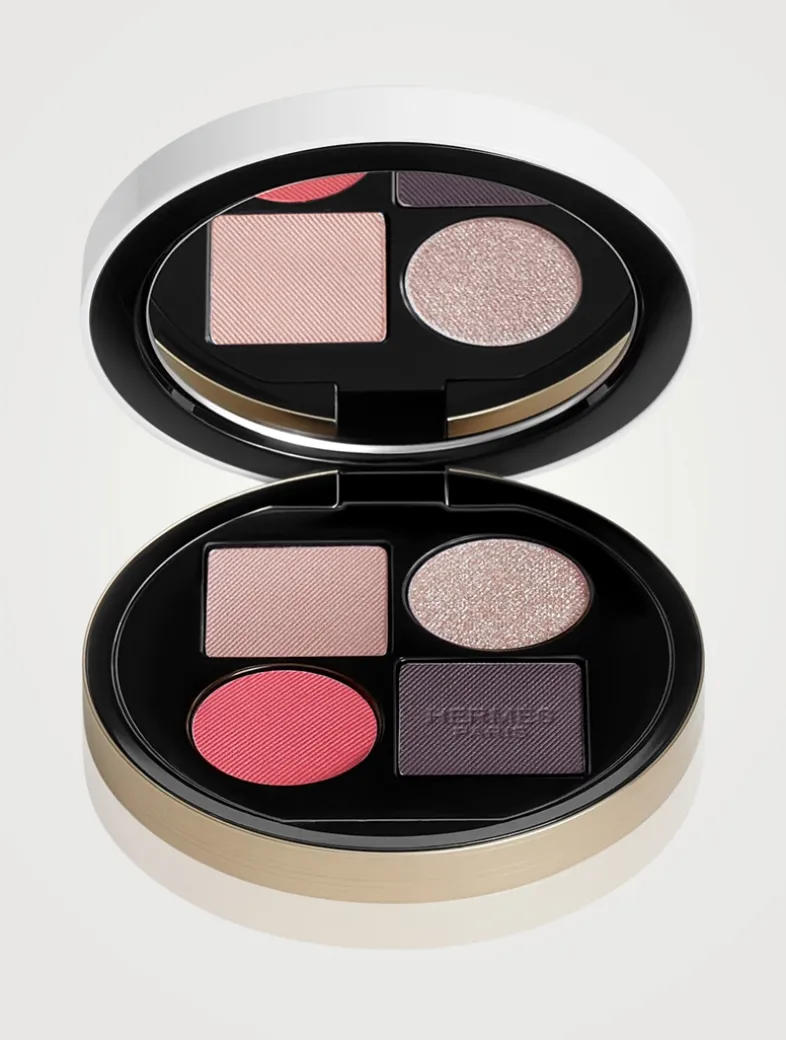 Six colour palettes offer various avenues of expression for the eyes, creating a natural, intense or sophisticated look. Each quartet is composed of a graduated trio of powders complemented by a fourth, bold and unexpected shade. All can be used individually or combined to create a subtle, seamless blend of shadows. Designed by Pierre Hardy, this quartet of eyeshadows plays with geometric shapes and echoes the Bauhaus movement. Its round case is protected by a canvas drawstring pouch and includes an applicator brush in lacquered wood. The object is presented in an orange box. The eyeshadow quartets are composed of 98% natural ingredients. The powder contains silky emollients and oils, ensuring effortless application and a long-lasting, natural finish. The eyeshadows’ soft and light texture can be easily blended using a finger or brush, allowing you to achieve your desired level of intensity. In each palette, the various finishes draw inspiration from the silk metier. The matte finish evokes the essence of silk chiffon, the satin finish mirrors the allure of silk twill, and the shimmering finish is reminiscent of silk lame.