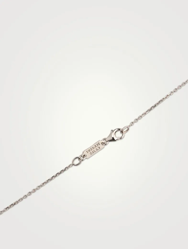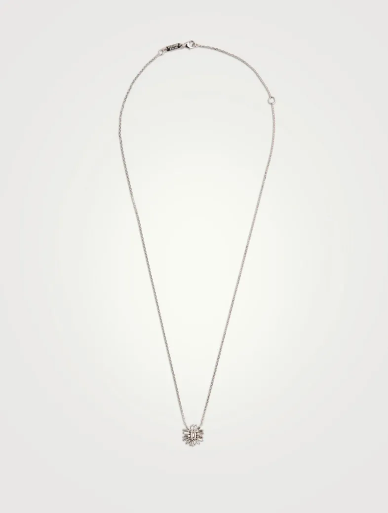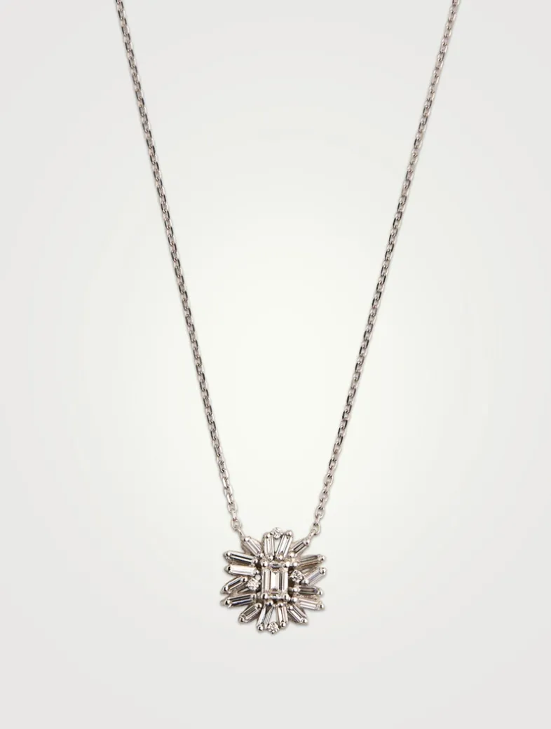 This adjustable chain necklace features a flower pendant with baguette-cut diamond petals and emerald-cut diamond centre.