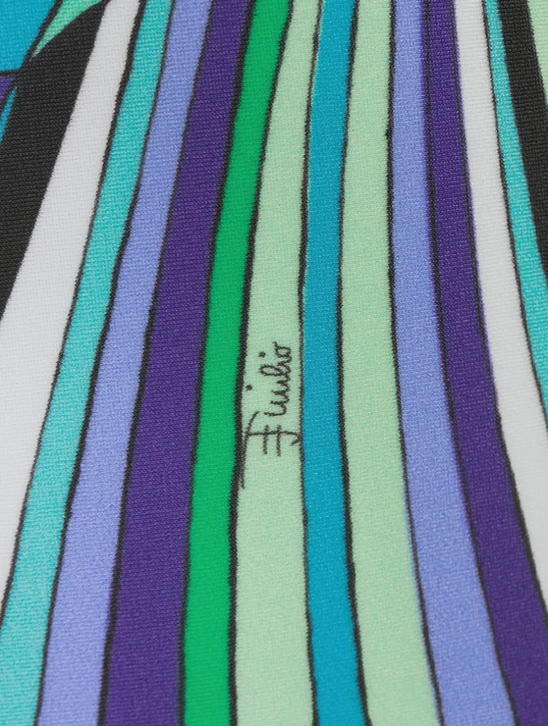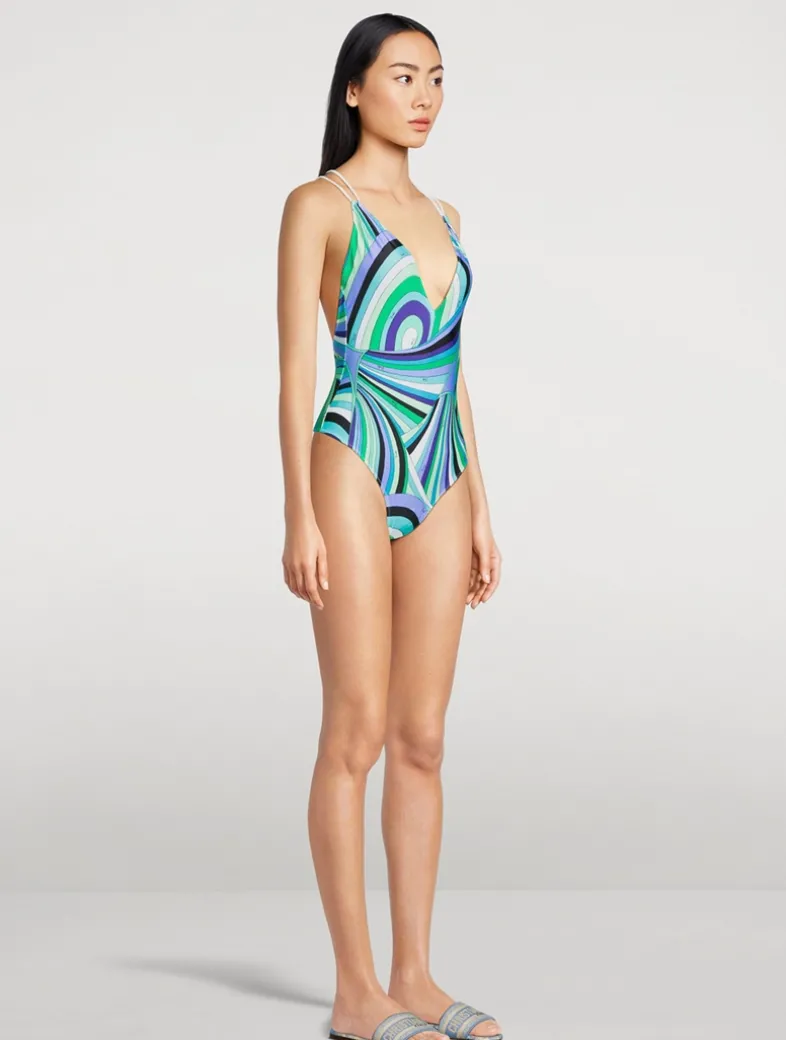 Dive into pattern play with this swimsuit, which is adorned with a contemporary iteration of the archival Iride print. It’s crafted from UV-protective eco-LYCRA® with a plunging V-neck and an open back with slim crossover straps. Kindly note that this product is made using an allover print and it falls differently on each garment, so the product you will receive may differ from the one in the picture.
