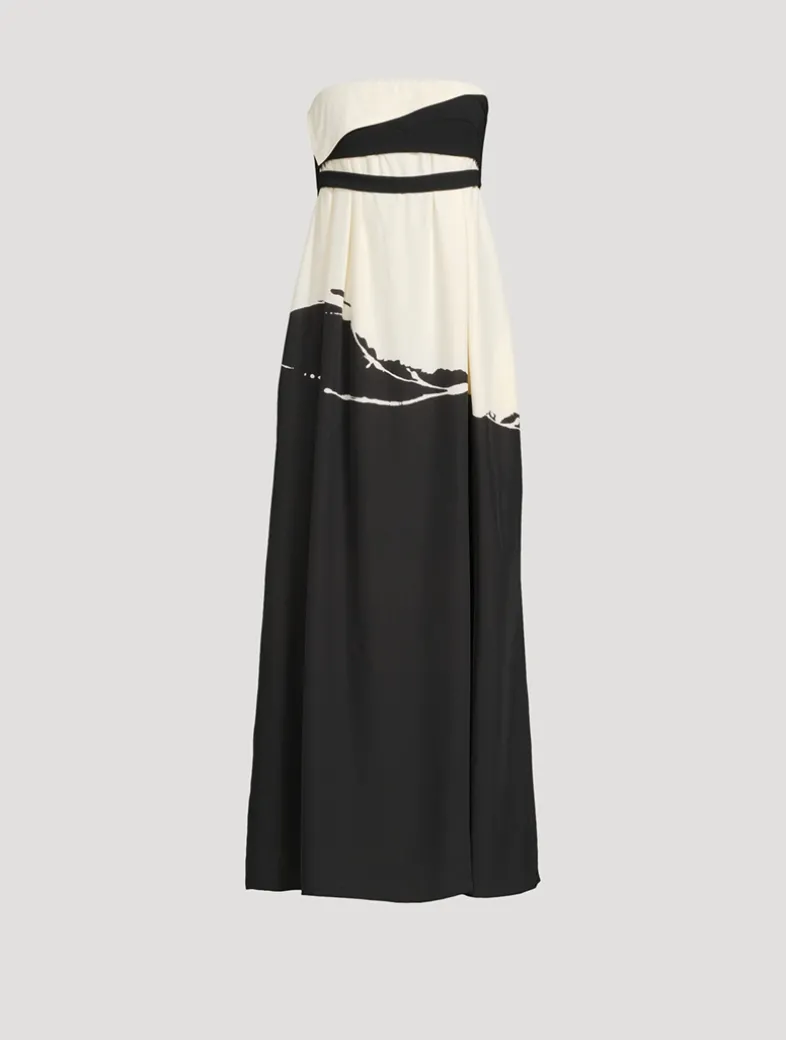The Ophelia maxi dress is designed with an abstract motif and cut to a strapless silhouette. Features a bustier-style bra with integral boning and padding, along with snap fastenings at the back. Finished with hidden slip pockets.