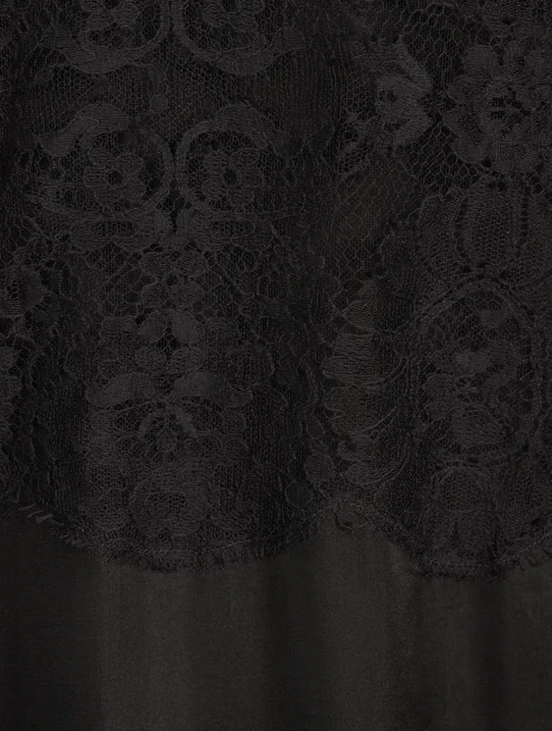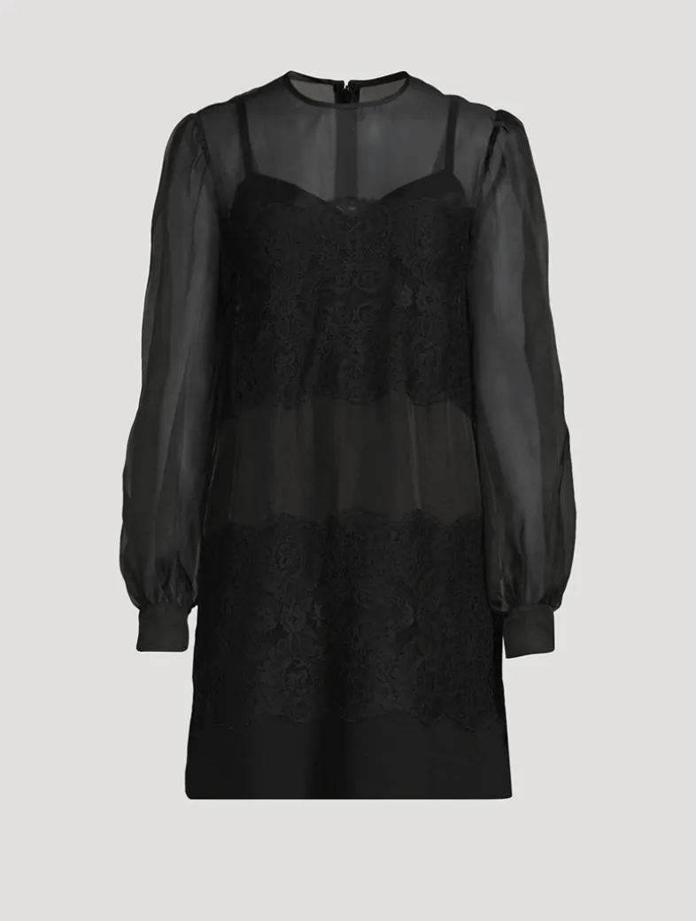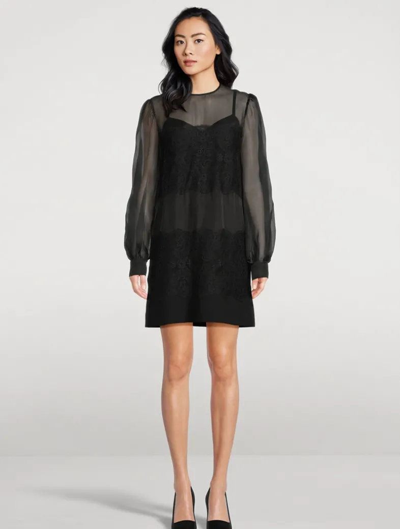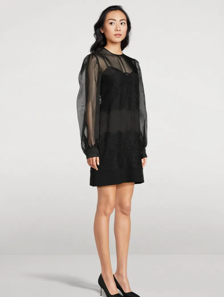 Flaunting a faux layered look, this silk organza mini is detailed with a delicate floral lace inlay, mimicking the look of a slip dress in stretch silk crêpe de chine. Semi-sheer long sleeves are topped with subtle puffed shoulders and finished with buttoned cuffs.