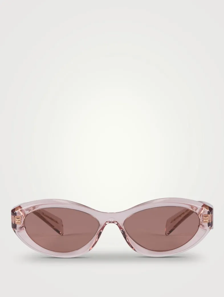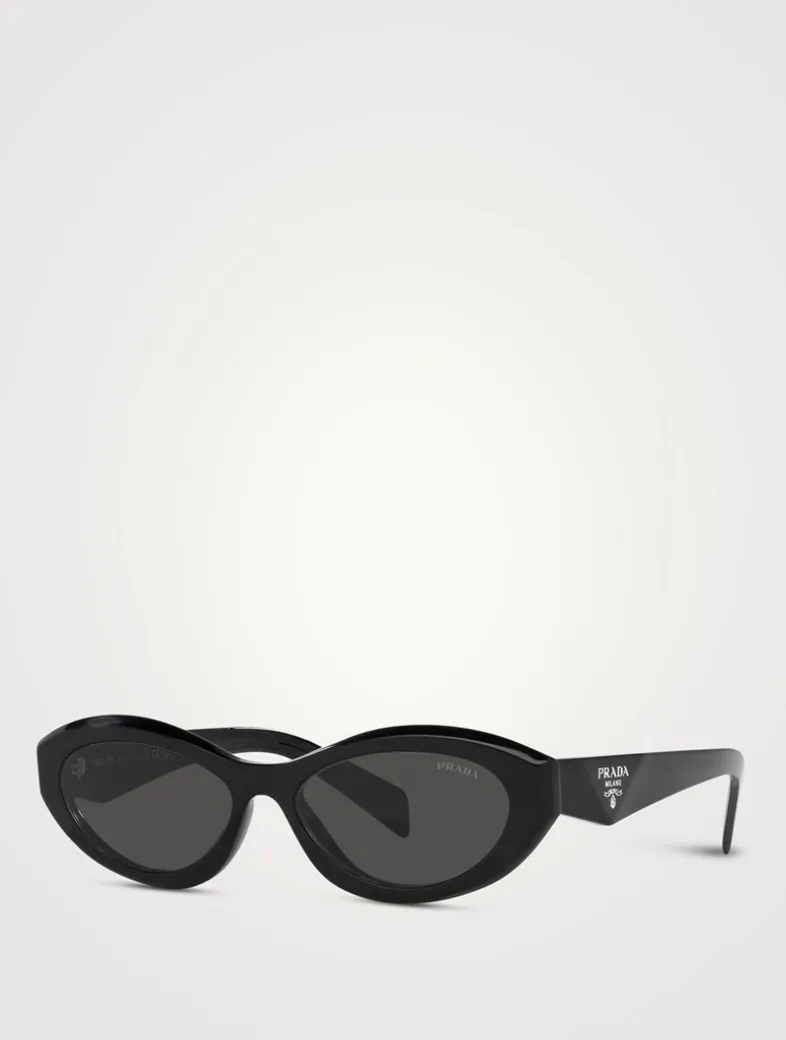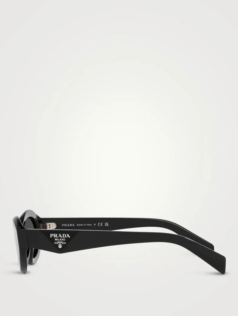 These glossy acetate sunglasses are crafted in a sleek oval shape. Defined by clean cuts and sharp angles, the three-dimensional temples are decorated with an iconographic interpretation of PRADA’s traditional triangle logo.