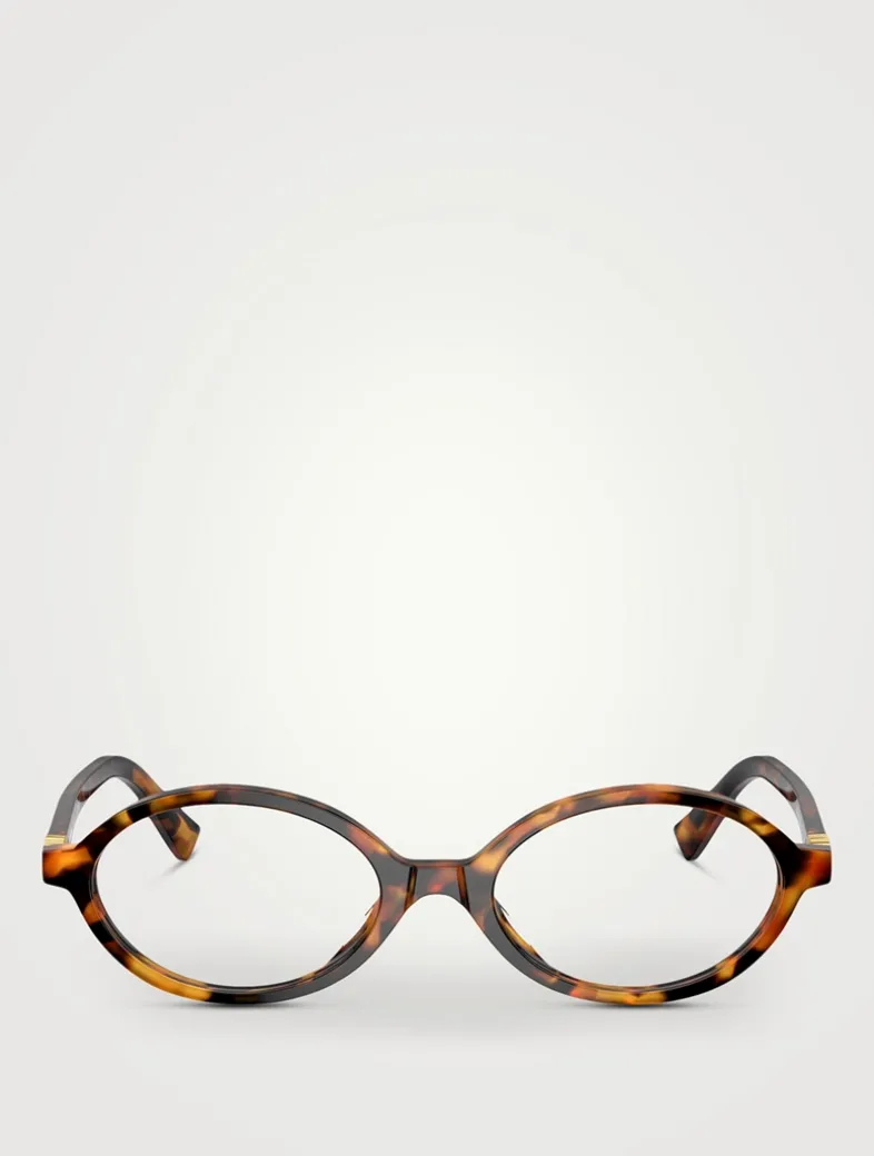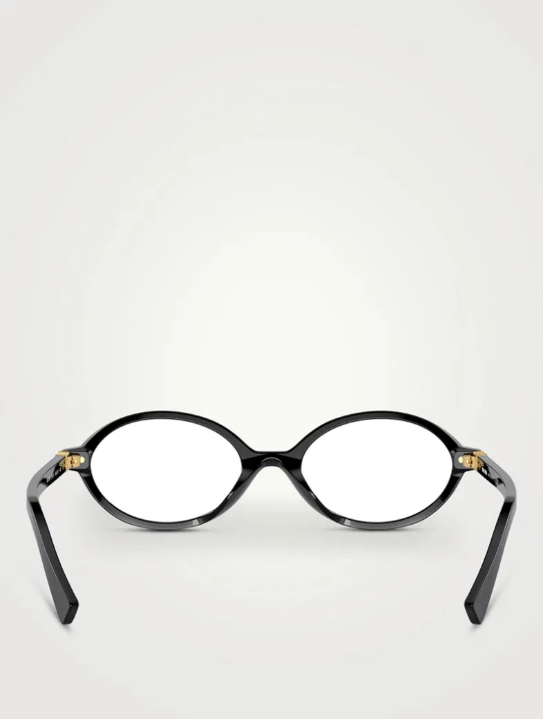 These glasses exude subtle sophistication with a vintage-inspired oval acetate shape in a slim design. The Miu Miu vertical logo serves as a chic accent and functional hinge, adding a touch of elegance to the frames. This style is not Rx-able.