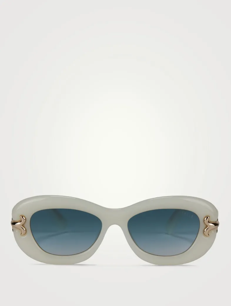 Made with an oval shape, these acetate sunglasses are detailed with metal embellishments at the temples, and Pucci logo print on the arm.