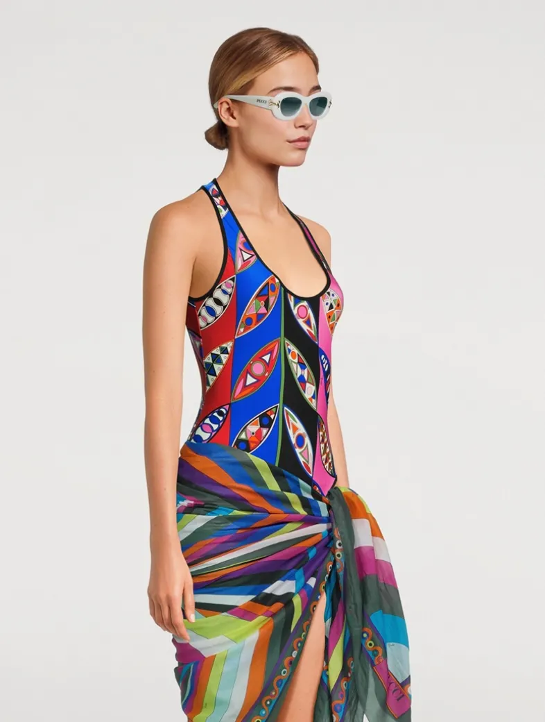 Made with an oval shape, these acetate sunglasses are detailed with metal embellishments at the temples, and Pucci logo print on the arm.