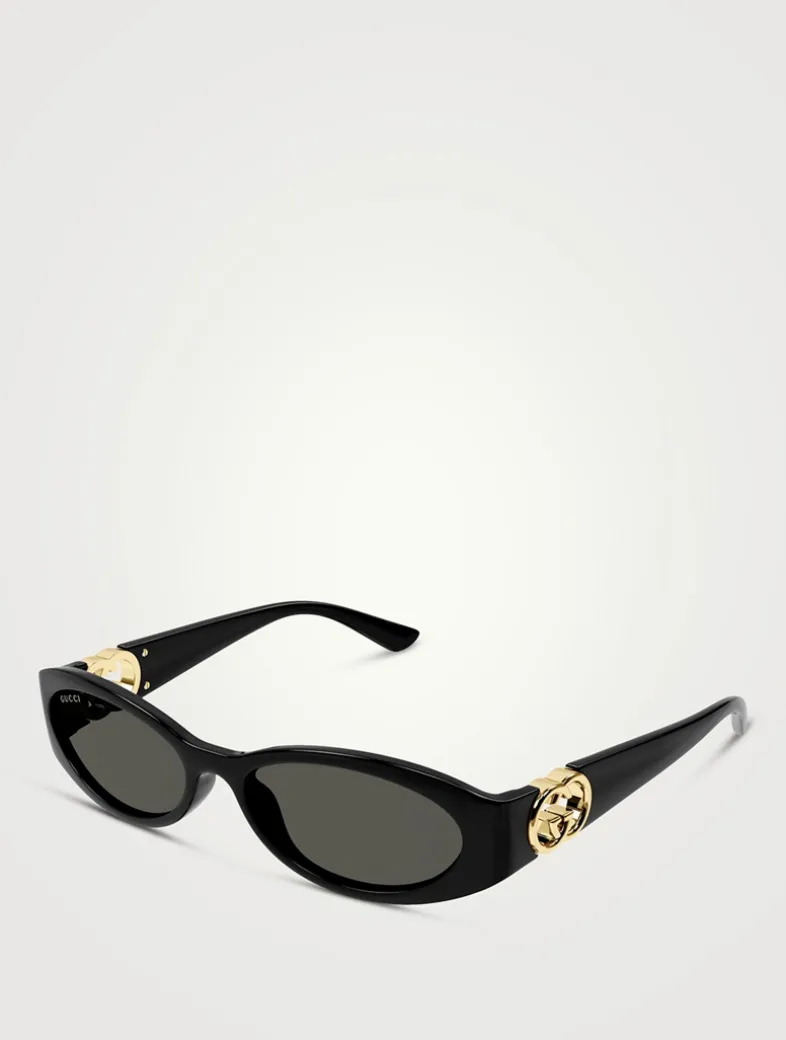 Crafted with an injection frame, this pair of sleek oval-shaped sunglasses is defined by round Interlocking G hinges in gold-toned metal at the temples.