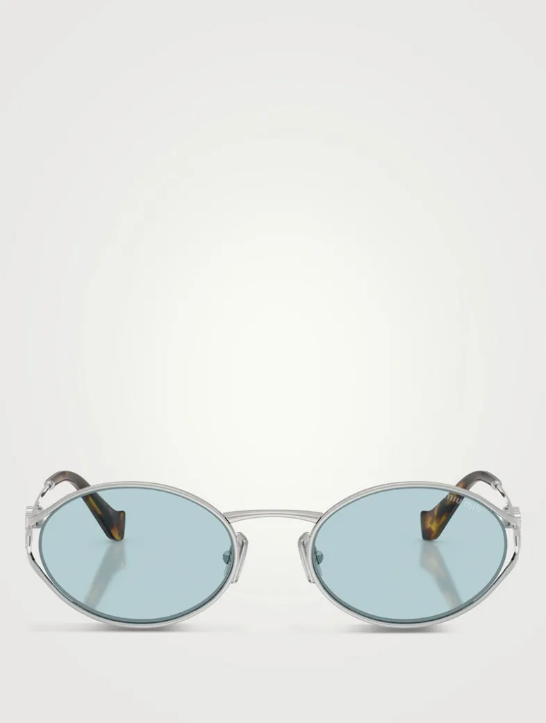 Exuding a classic vintage charm, these oval sunglasses feature the vertical Miu Miu logo, thin metal temples, and acetate temple tips for a comfortable yet stylish everyday wear.
