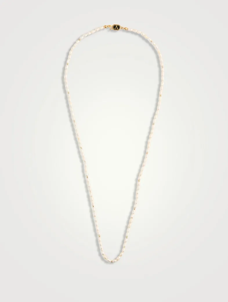 Strung with ovalette pearls, this long necklace is secured with a sleek enamelled VLogo clasp.