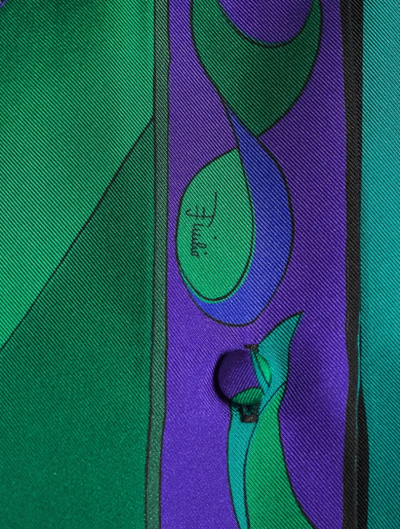 An icon of relaxed elegance, this silk twill shirt combines a refined silhouette with a contemporary twist. The slightly oversized fit, enhanced by a classic collar and button closure, offers the perfect balance of structure and fluidity. A discreet side pocket adds functional detail, while the Pesci print lends dynamism and character to the garment.