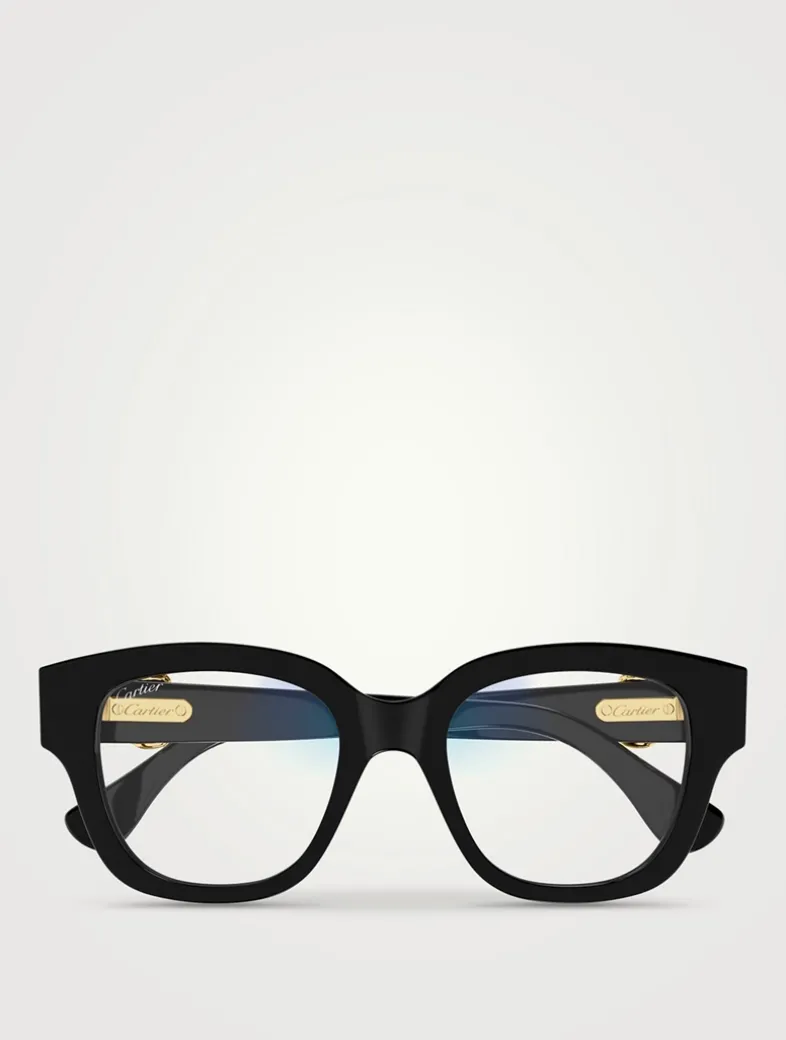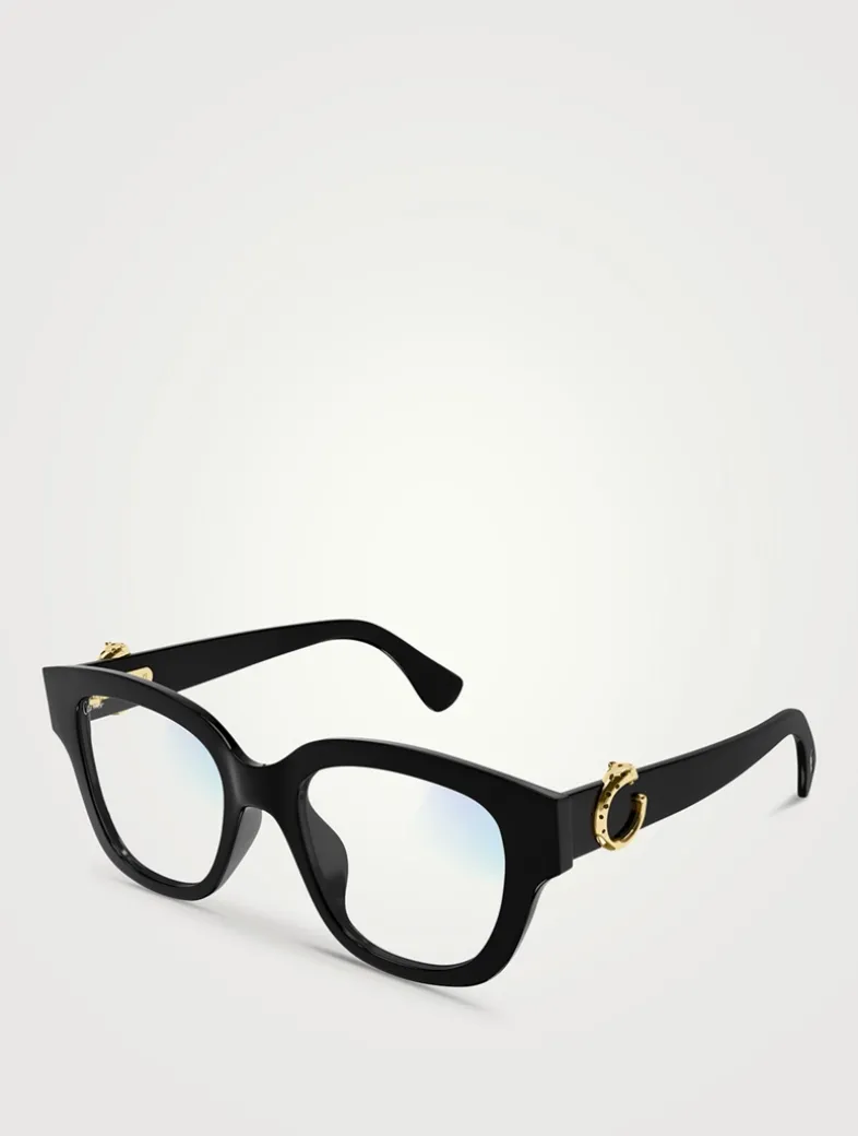 Set in recycled acetate with a bold, oversized silhouette, these square eyeglasses are highlighted by smooth, golden-finish panther C’s at the temples.