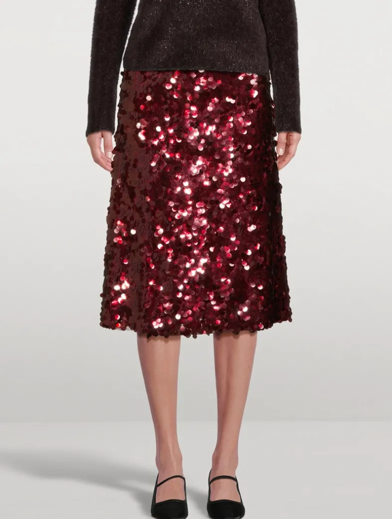This bias-cut skirt is appliquéd with three different kinds of paillettes in varying intensities of the same shade that gleam in the light. Fully lined, it has an elasticized interior waistband with a concealed back zip closure.