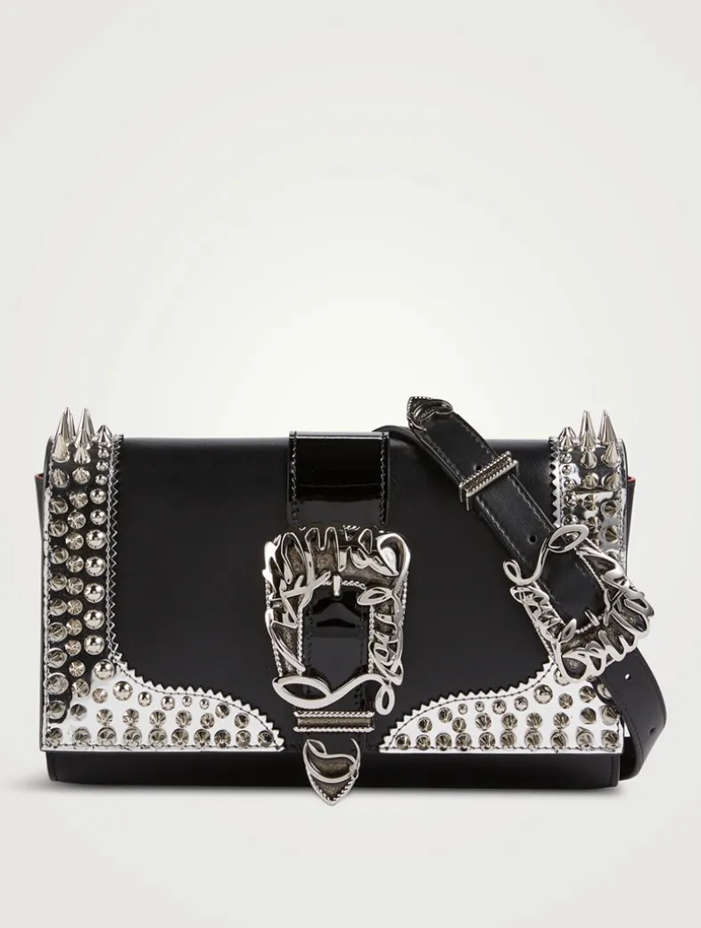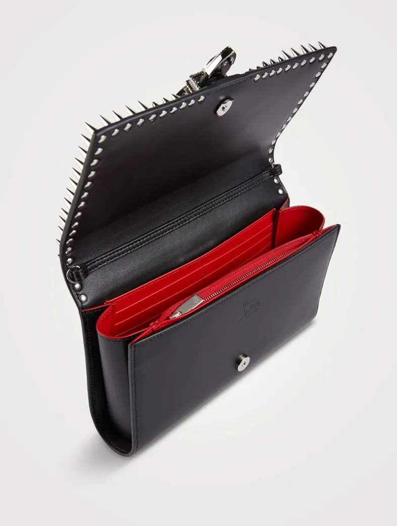 The Paloma clutch has a striking, elegant style. This slender design is crafted in nappa leather adorned with signature Maison Christian Louboutin spikes and an iconic oversized buckle. A detachable leather-reinforced chain strap allows it to be carried by hand or worn over the shoulder. The interior features three pockets and 10 credit card slots.
