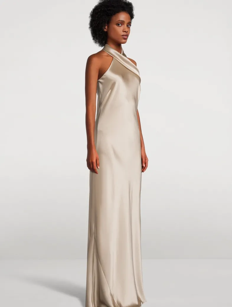 The floor-sweeping Pandora dress is cut on the bias for an ultra-flattering silhouette that glides over your curves. It has a modern halter neckline and a luxuriously long sash that cascades down the back.