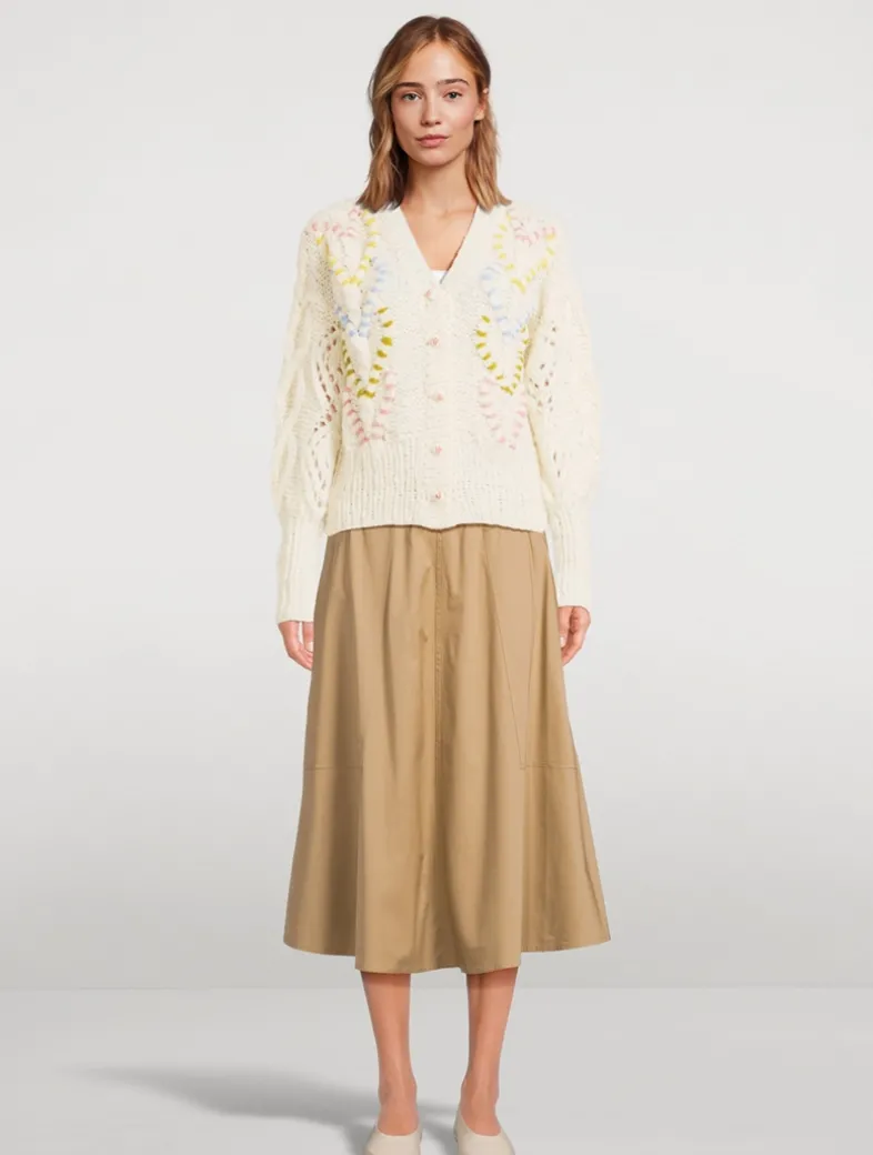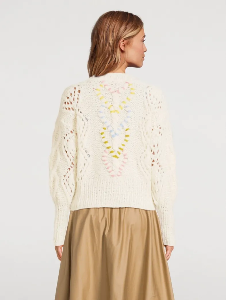 This heart-shaped handknit cardigan features multicolour embroidery and crochet-embroidered buttons, all crafted by skilled artisans in Peru.