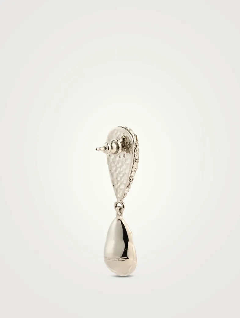 A large stone hangs from delicate teardrop shapes, each set with matching pavé crystals, combining bold design with detailed craftsmanship.