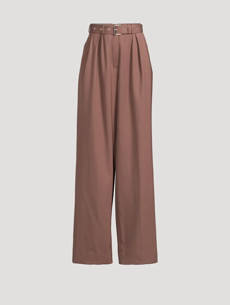 Crafted from a luxe wool gabardine, these trousers exude a polished appeal. They are cut to sit high on the waist and fall to a pleated, wide-leg silhouette. Finished with a matching fabric belt.