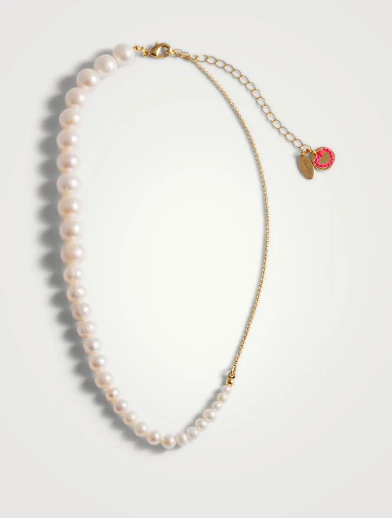 An asymmetrical design, this thin-link chain necklace features graduated freshwater pearls, increasing in size step-by-step to make the classic strand of pearls modern and eye-catching.