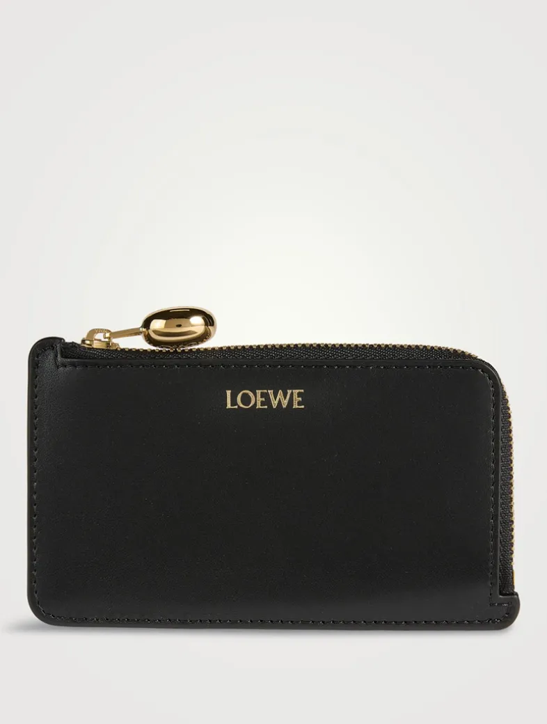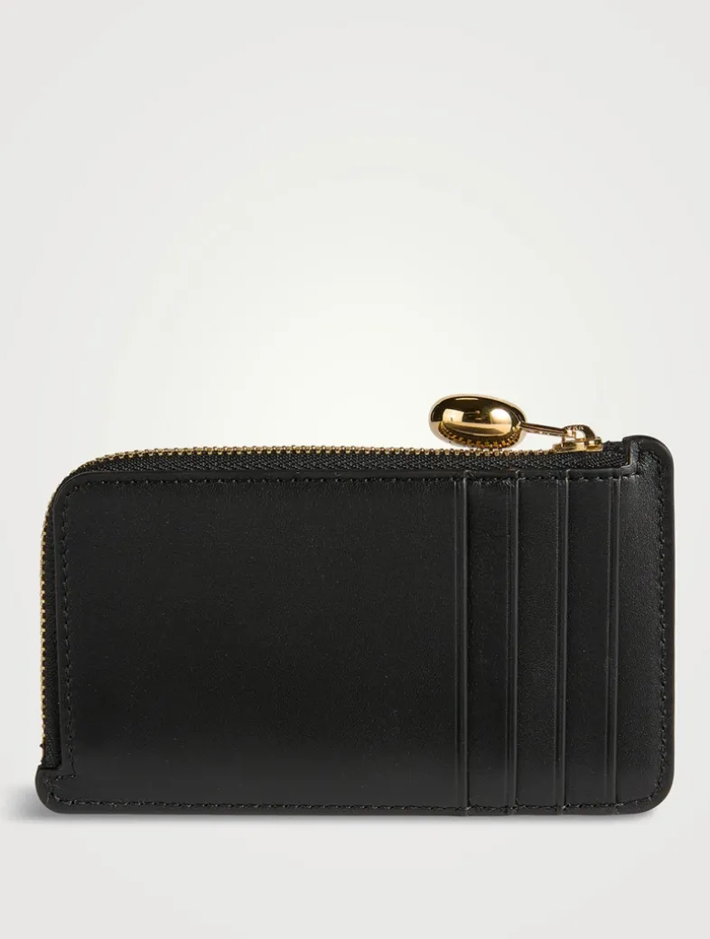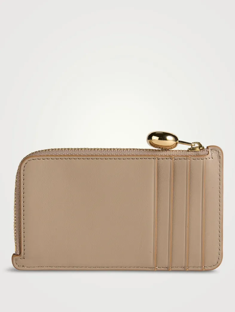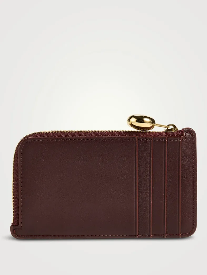 This slim leather card case has a zippered closure finished with a pebble-shaped puller. It is finished with four slots at the back.