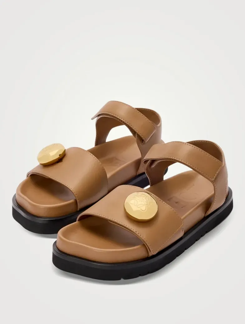These sandals are crafted in soft calfskin featuring a signature petal-toe shape, a gold-finish Anagram Pebble on the upper, and a double sole.
