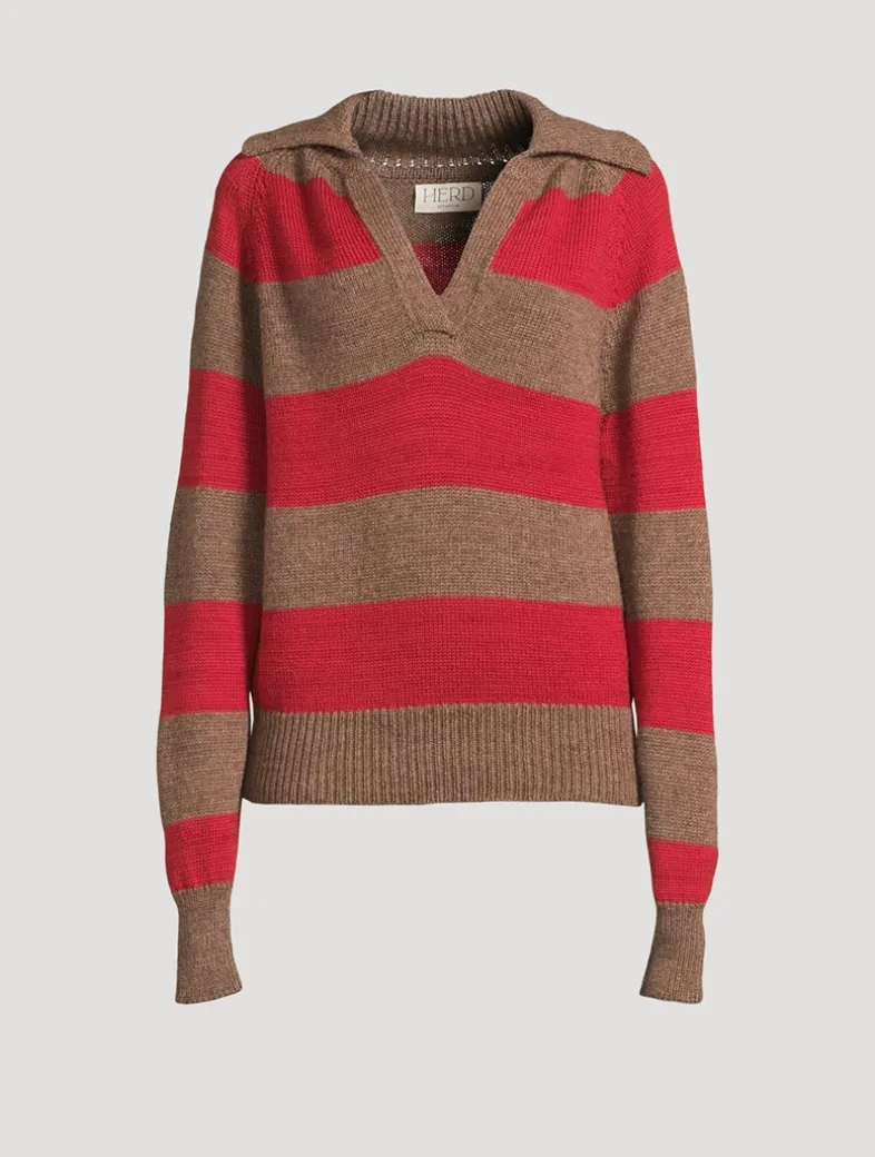 Elegant, chic, cool, and effortlessly sporty. Made from pure Bluefaced Leicester wool, it’s crafted from soil to skin without chemicals, soft enough to wear on bare skin or layered with ease. Designed with a deep V-neck, classic rugby collar, raglan shoulders, straight sleeves, and generously ribbed cuffs and hem, it’s made in collaboration with intergenerational craftspeople, supporting rural economies and heritage techniques.