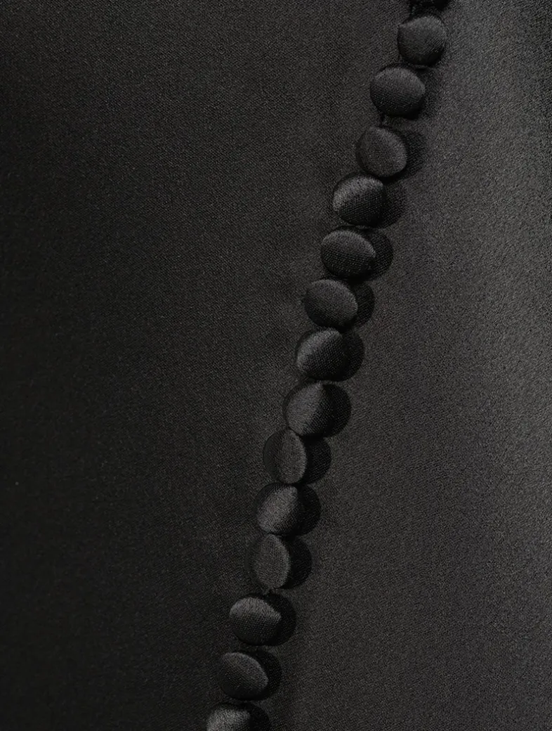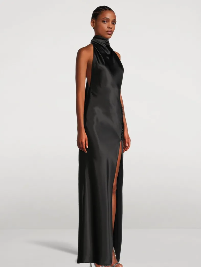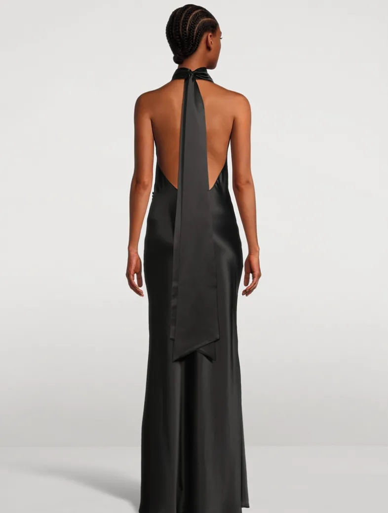 Bias-cut from lustrous satin, this stunning gown is designed with a high neckline, a low-cut back and open sides, a thigh-high side slit with covered buttons at the hip, and large statement ties at the back of the neck.