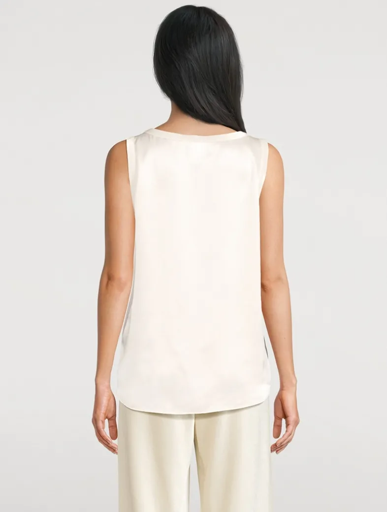An L148 elevated essential, this sleeveless blouse is crafted from lustrous silk charmeuse that reverses to a smooth matte finish. The minimalist design is defined by a rounded neckline and softened shirttail hem.