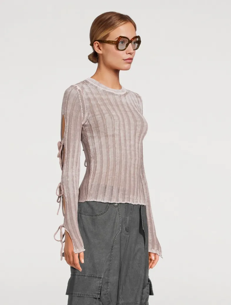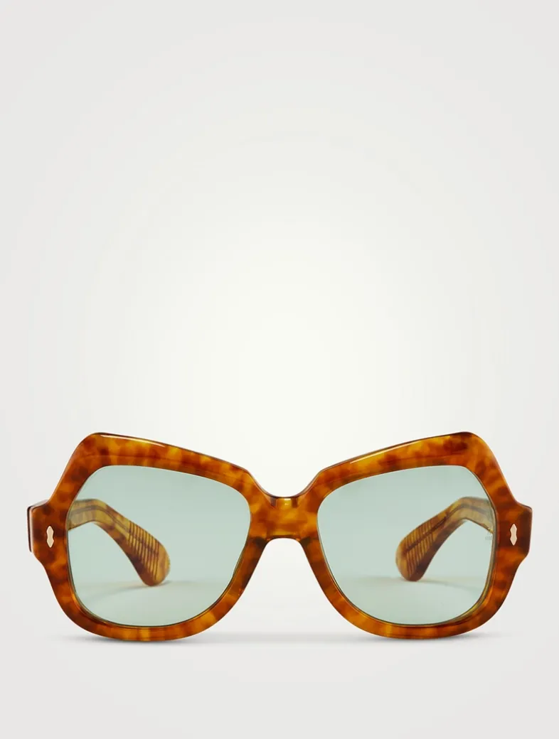 Sculptural and balanced, these sunglasses make a statement with their oversized yet soft lens shape, exaggerated brow line, and low-set arms. Jacques Marie Mage’s double arrowhead pins lend a signature finish.