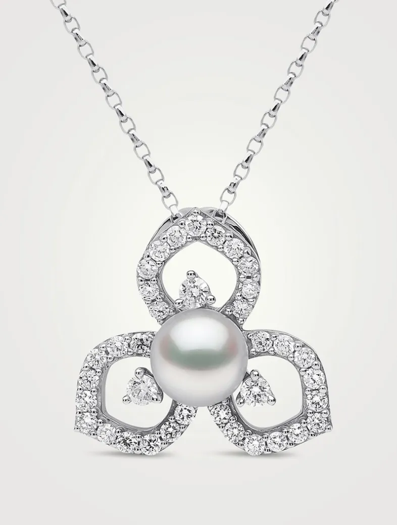 Part of the Petal collection, this necklace expresses the wonder of a flower in full bloom. The intricate design features a luminous Akoya Pearl surrounded by scintillating diamond petals for a pendant that is both whimsical and elegant.