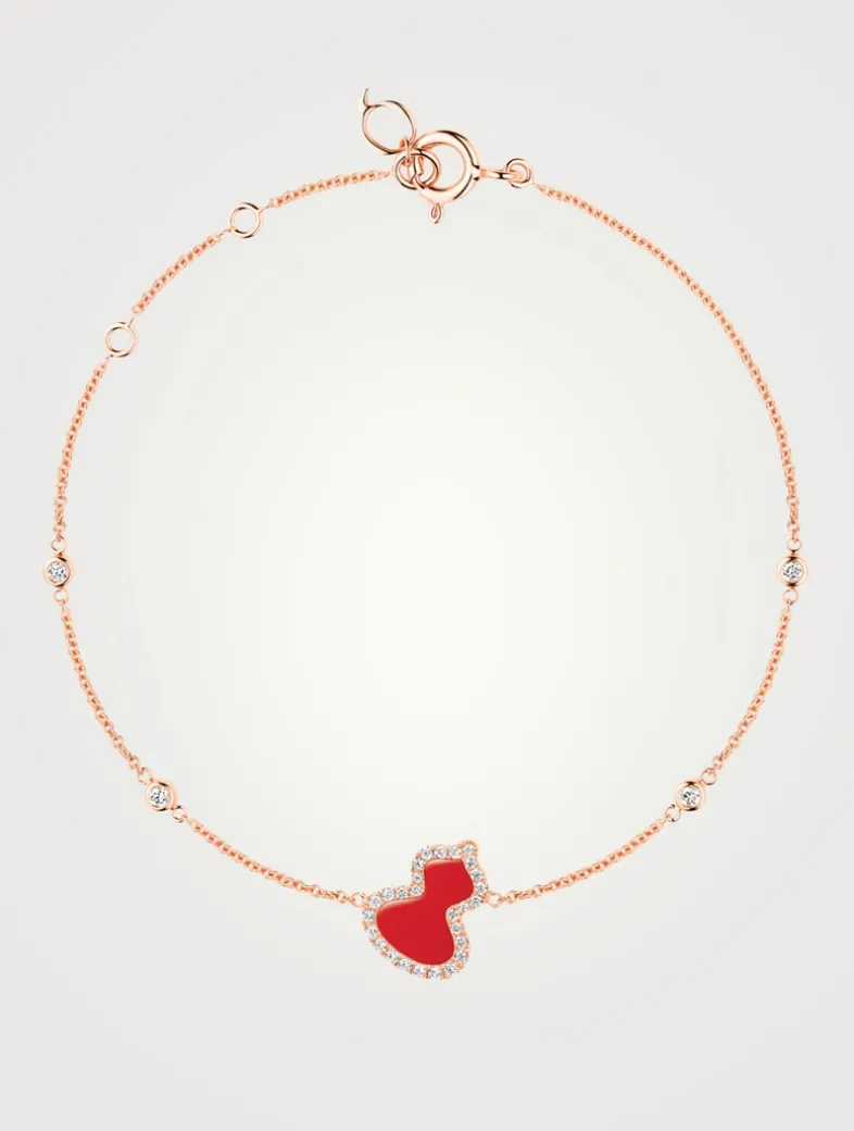 Echoing the curves of the lucky number 8, Wulu is the most powerful symbol of good fortune and positive energy in China. Set on a dainty diamond-dotted chain, this bracelet features the signature Wulu pendant framed with 31 diamonds and filled with polished red agate.