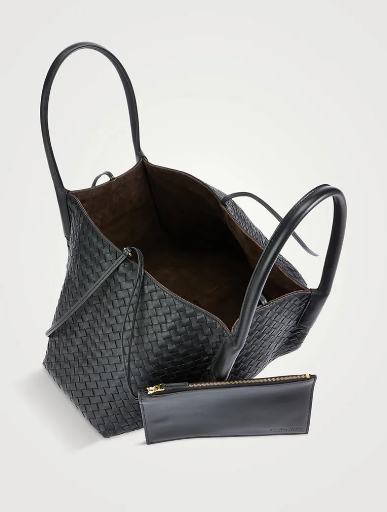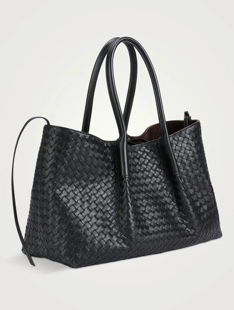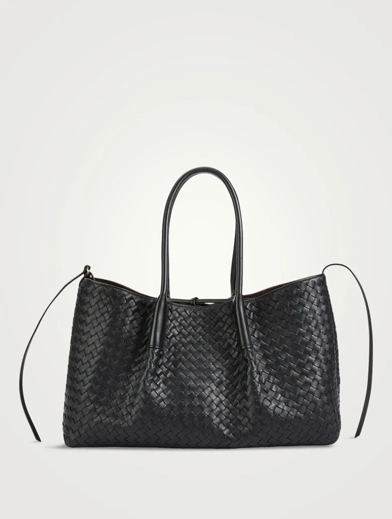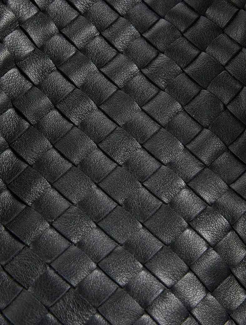 A reversible design allows this tote to showcase either a woven leather construction or a plush suede one. The slouchy bag has a single interior compartment, self-tie closure, and a detachable interior zippered pocket.