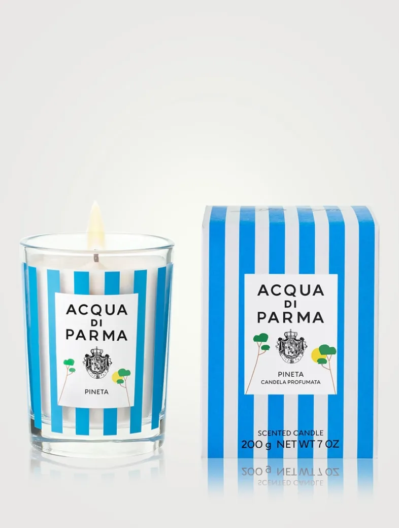 Set in a blue and white stripe jar designed by Ben Arpea, the seasonal exclusive candle diffuses a scent embodying the essence of a shaded trail beneath maritime pine trees.