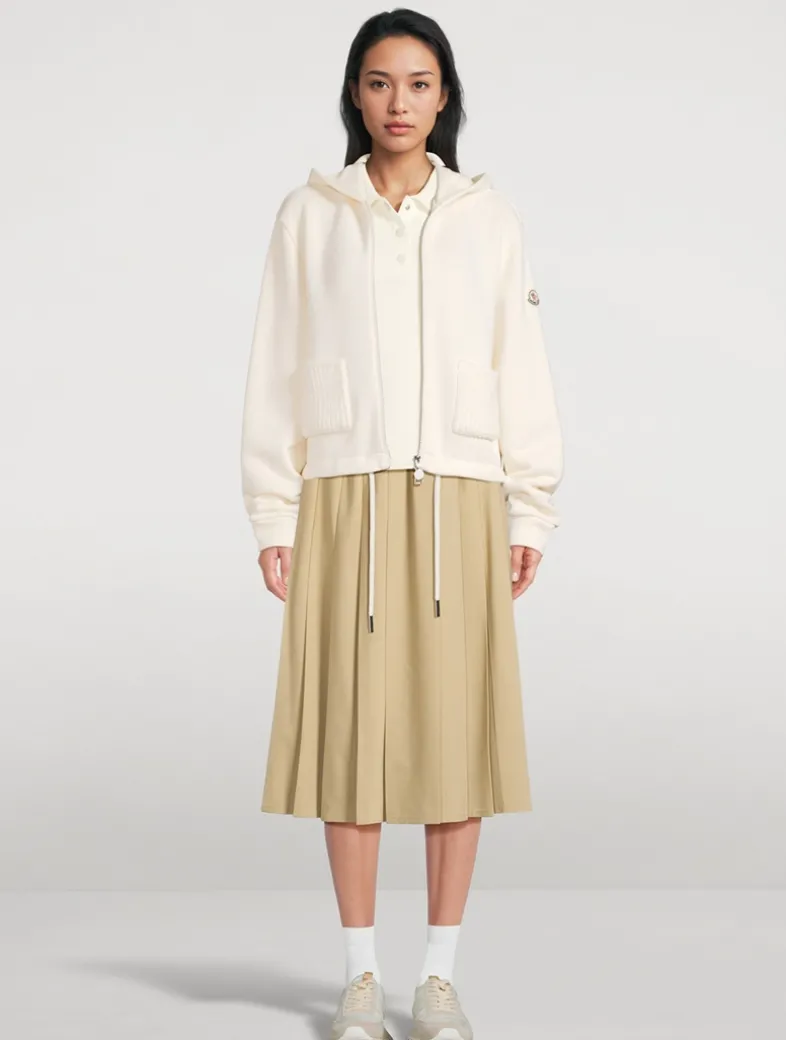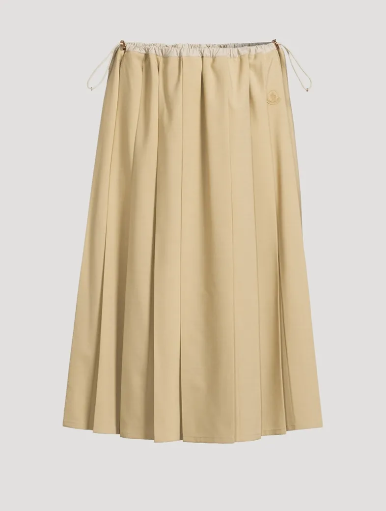 A subtle nod to varsity sports uniforms, this midi skirt is characterized by a pleated design. Ensuring comfort throughout the day, the piece features an adjustable drawstring waist.