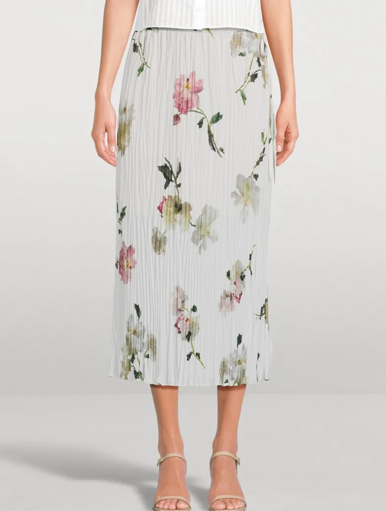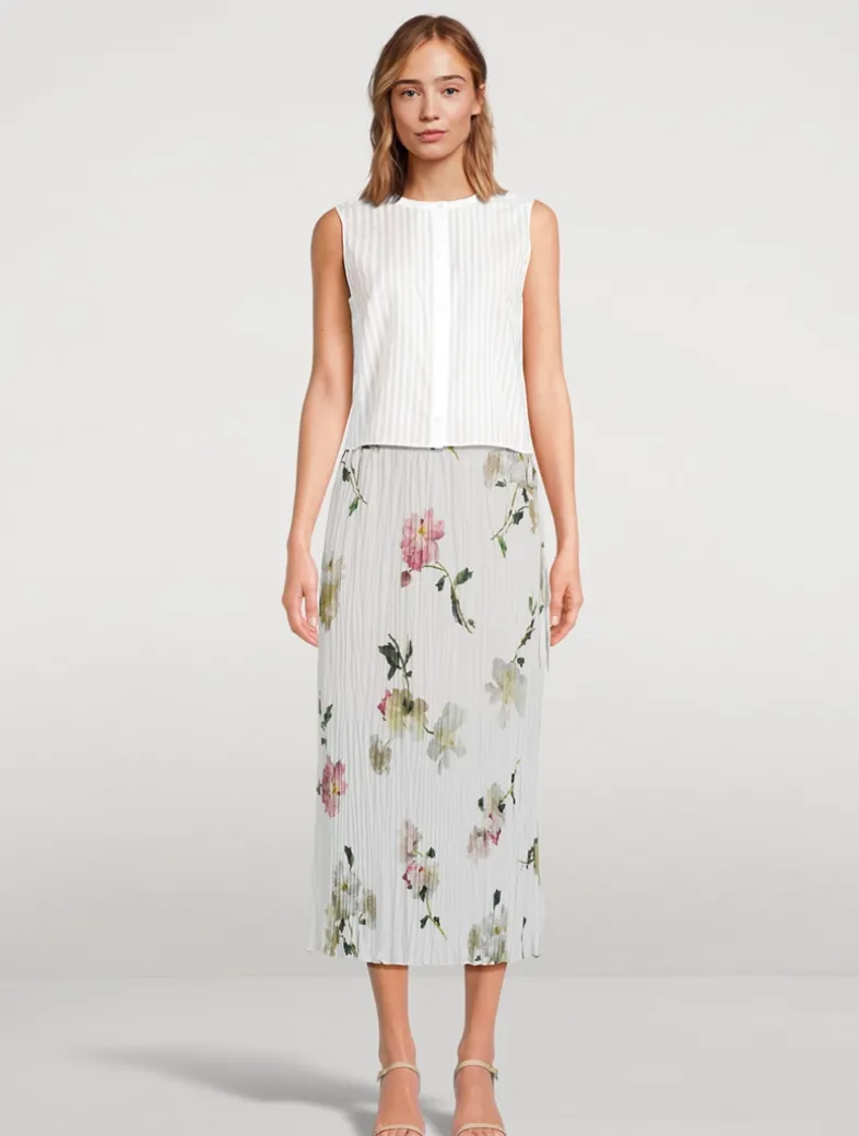A bouquet in the Vince studio planted the seeds for this side-tie midi skirt. The bunch was photographed and printed atop lightweight crêpe de Chine, finished with a crushed texture for added dimension.